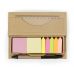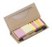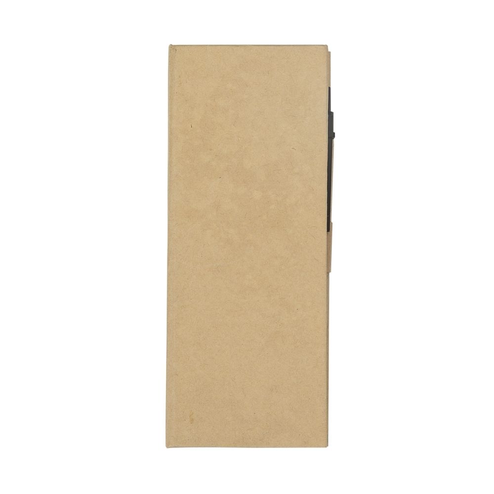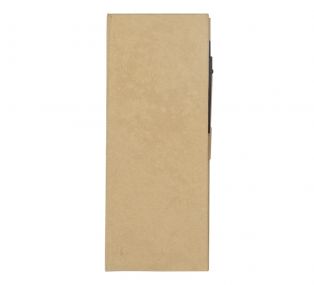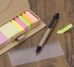 Bloco de anotações ecológico com caneta e post-it. Bloco retangular de papelão com frente e verso liso, contra capa possui um “bolso” com régua plástica fosca de 12 cm. Possui cinco blocos coloridos auto-colantes com aproximadamente 130 folhas e dois blocos rascunho rosa e amarelo com aproximadamente 130 folhas. Suporte de papel com caneta de papelão de clip e ponteira plástica. observação: 16,1 cm x 6,5 cm – Caneta 14 cm x 1,5 cm