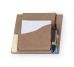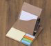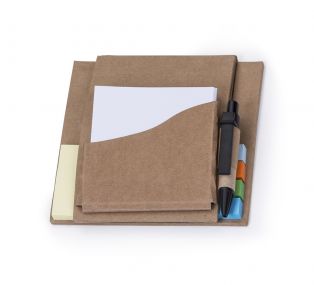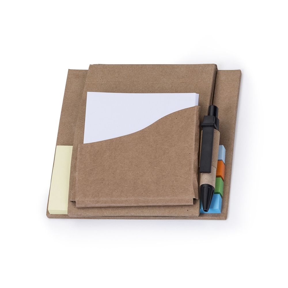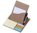 Bloco de anotações ecológico dobrável com post-it e caneta. Bloco possui um suporte com folhas brancas(aproximadamente 50 folhas) que ao ser inclinado fica em pé, neste mesmo suporte há uma “alça” de papelão que com uma mini caneta papelão com clip e ponteira plástica preta. Quatro blocos coloridos auto-colantes com aproximadamente 50 folhas e bloco amarelo com aproximadamente 50 folhas.