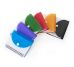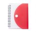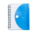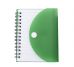 Bloco de anotações plástico com capa colorida e botão, possui espiral preto e parte interna transparente. Tem aproximadamente 66 folhas.