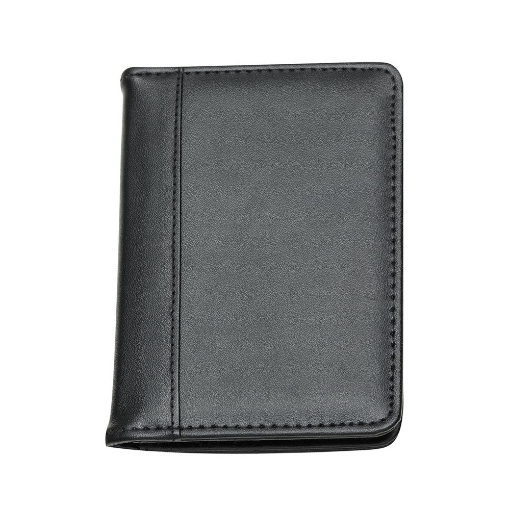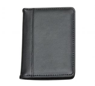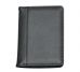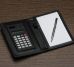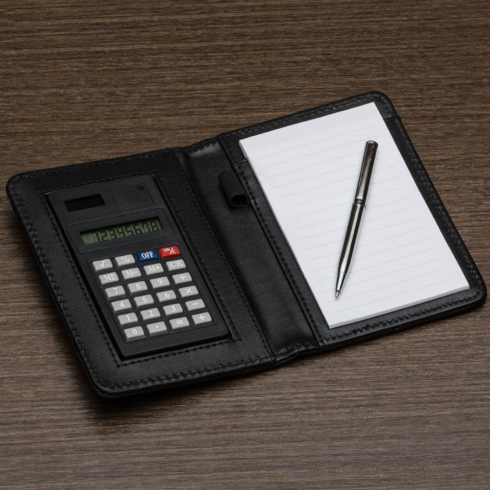 Bloco de anotações com capa de couro sintético. Possui calculadora solar plástica de 8 dígitos, uma caneta plástica com clip de metal acionada por giro e bloco de anotações pautado com aproximadamente 30 folhas.