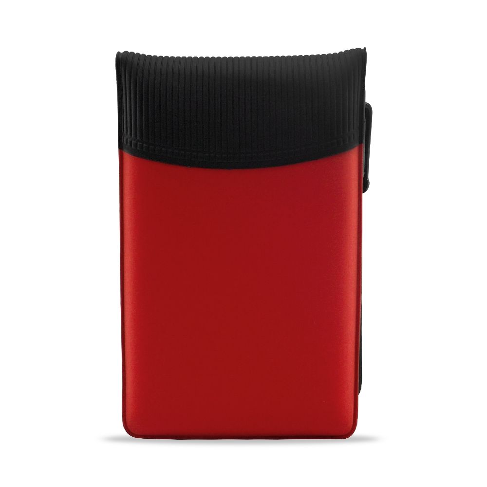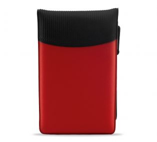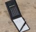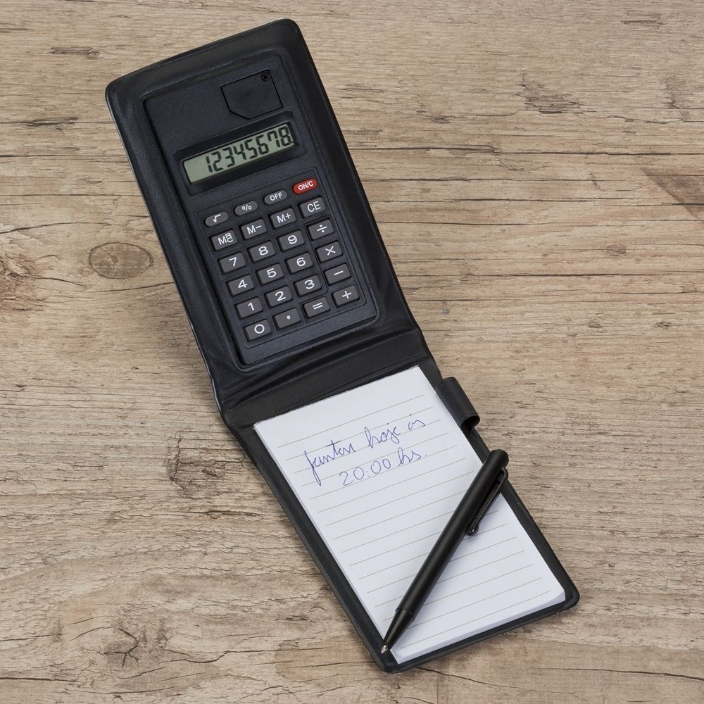 Bloco de anotações de couro sintético com calculadora e caneta. Capa colorida com detalhe emborrachado superior preto, parte interna com calculadora de 8 dígitos, suporte lateral com mini caneta plástica preta com acionador superior e destravamento lateral, bloco de anotações branco pautado(verso branco) com aproximadamente 30 folhas. Calculadora acompanha 1 bateria R1130.