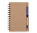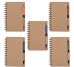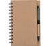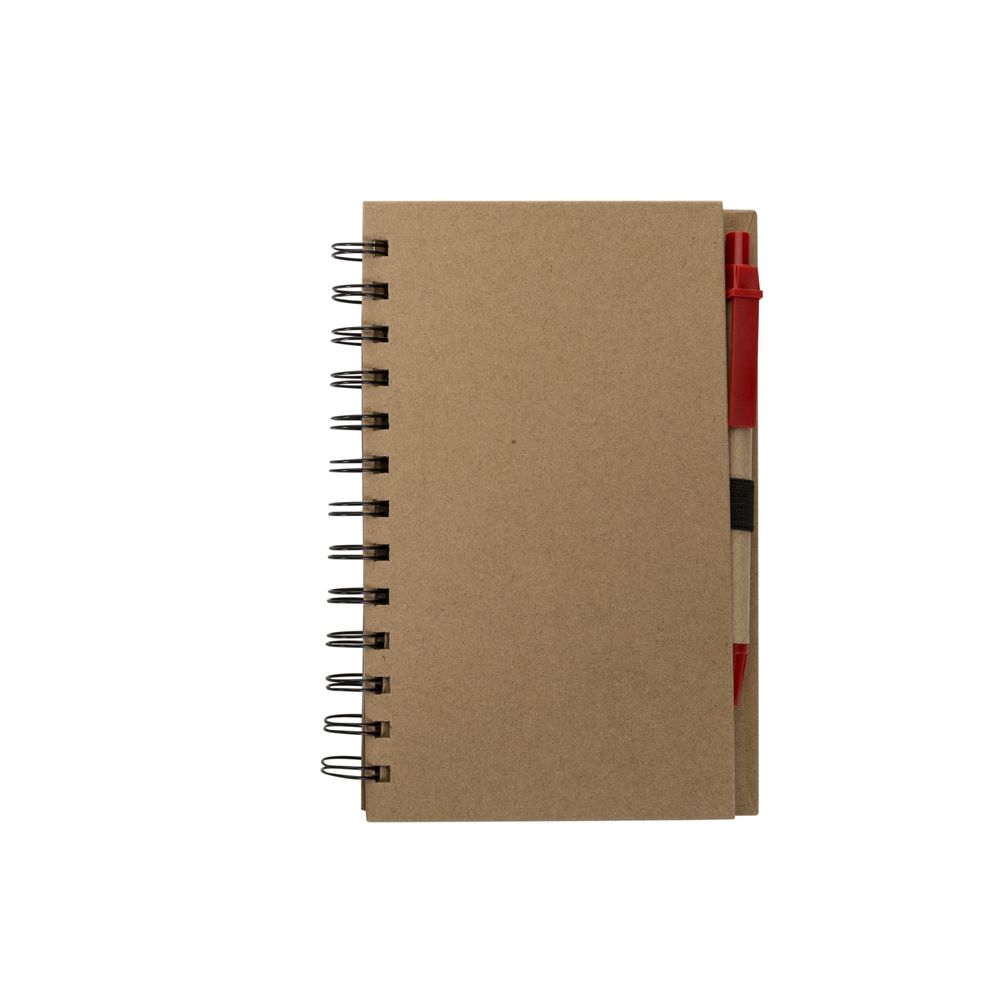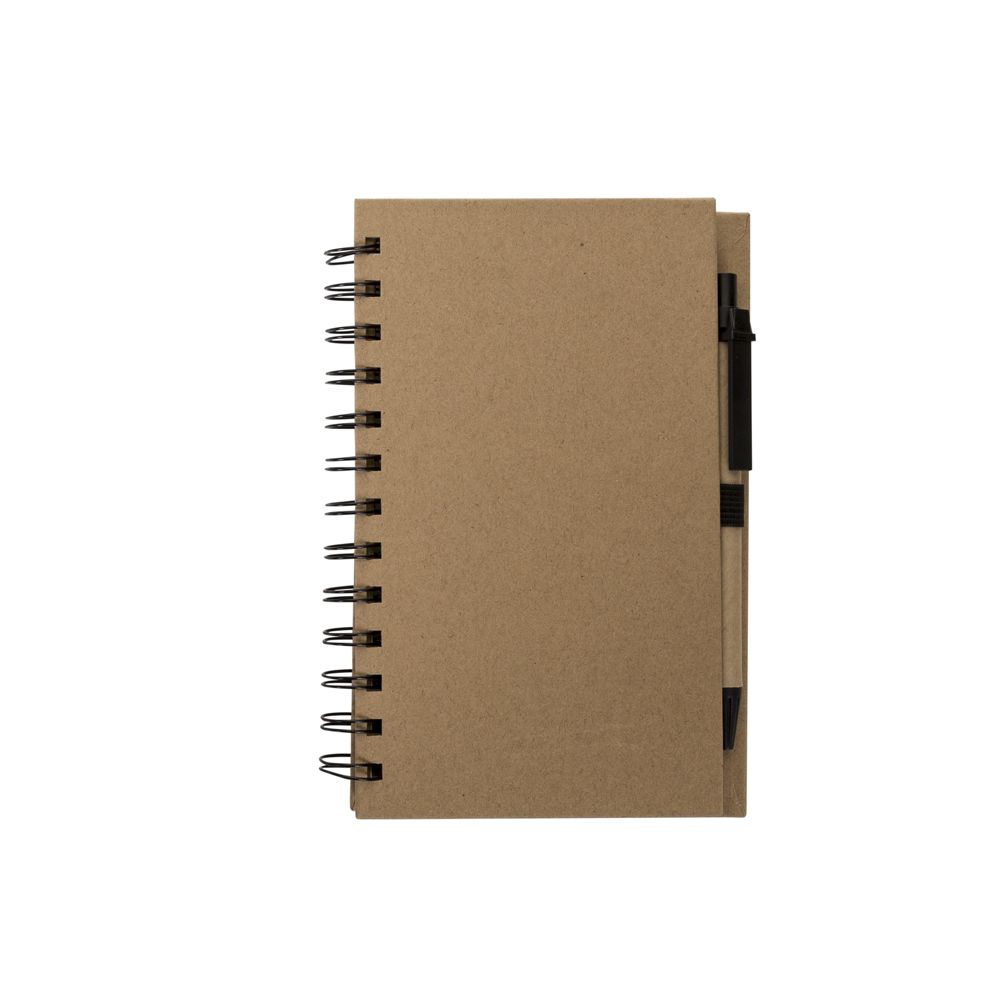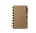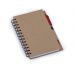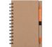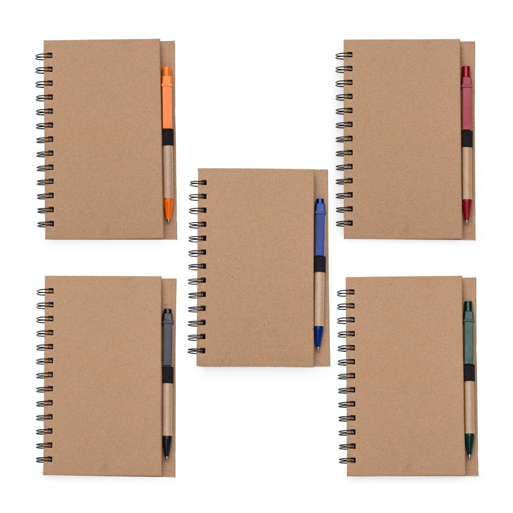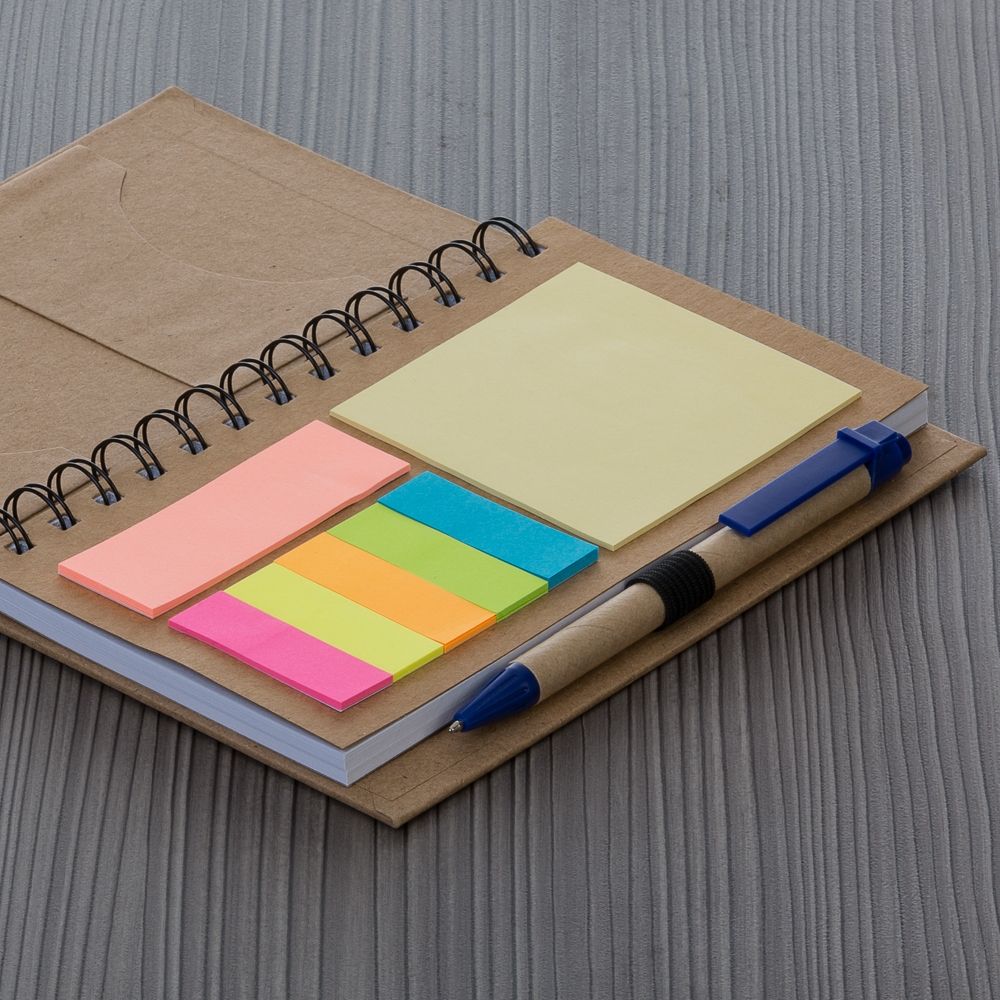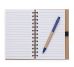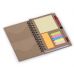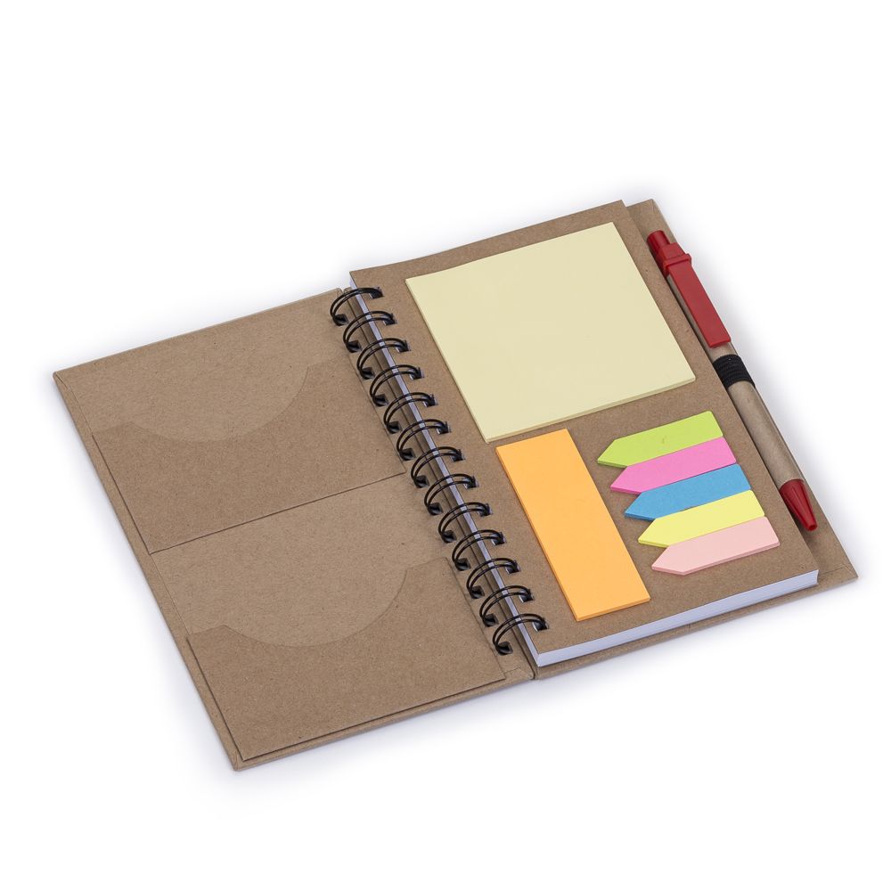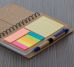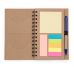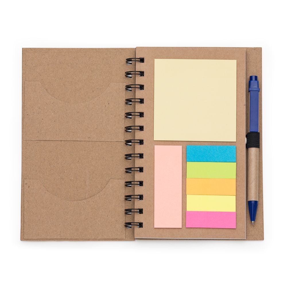 Bloco de anotações ecológico com caneta e post-it. Bloco com dois suporte internos para cartão, possui cinco blocos auto-colantes com 20 folhas cada, bloco laranja e bloco amarelo com aproximadamente 20 folhas cada. Possui aproximadamente 70 folhas brancas pautadas e caneta de papelão de clip e ponteira plástica..