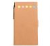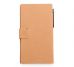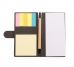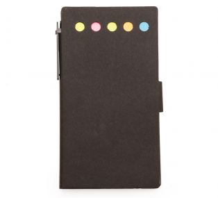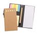 Bloco de anotações ecológico com caneta reciclada. Possui uma trava na própria capa, caneta de papelão com acabamentos em plástico acionada por clique, cinco blocos auto colantes coloridos com aproximadamente 20 folhas cada, bloco de post-it amarelo com aproximadamente 20 folhas e bloco com aproximadamente 50 folhas brancas sem pauta.
