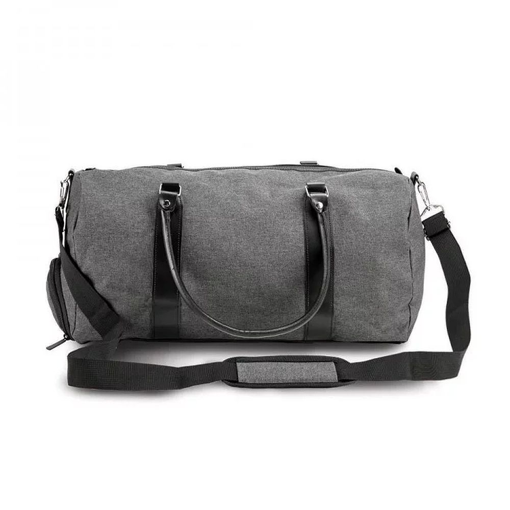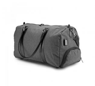 Descrição: Bolsa de viagem em poliéster 600D e PU. Parte externa com suporte para entrada USB e cabo acoplado internamente, permitindo a conexão de um carregador portátil na área interna e a conexão de um eletrônico na área externa sem precisar abrir a bolsa; possui pequeno bolso lateral, compartimento principal com bolso interno de duas divisórias. Parte inferior com suportes plásticos para não ter encostar a mala diretamente no chão; possui alças para mãos, acompanha alça transversal para encaixe e sacola TNT.