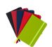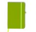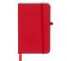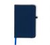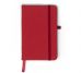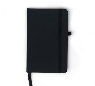 Caderneta tipo moleskine emborrachado com porta caneta elástico em nylon, marcador de página em cetim e fita elástica de nylon para fechar. Contém aproximadamente 80 folhas pardas pautadas.