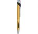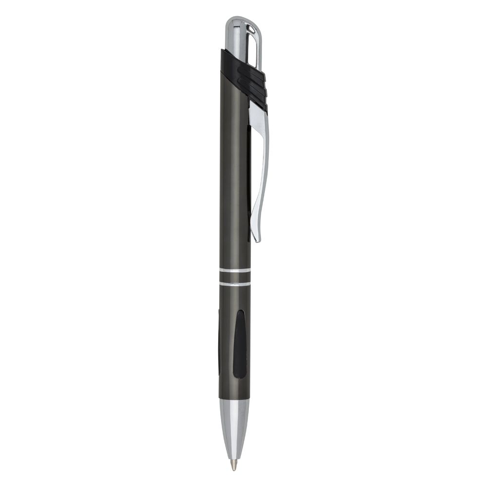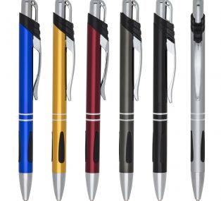 Caneta metal inteira colorida com detalhes prata. Clip metal com detalhe preto com relevo em plástico, possui dois anéis e detalhe emborrachado preto na parte inferior. Aciona por clique.