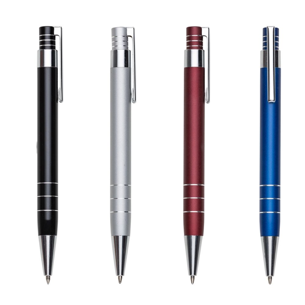 Descrição: Caneta metal fosca inteira colorida com detalhes prata. Clip metal e com três anéis na parte superior e outros três na parte inferior. Aciona por clique. OBS.: PEDIDO APENAS MÚLTIPLO DE 50 PEÇAS!