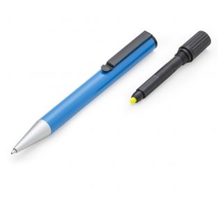 Descrição: Caneta metal inteira colorida com marca texto. Clip de metal preto, para utilizar o marca texto basta desrosquear a tampa superior(possui relevo e detalhe amarelo na ponta). Esferográfica aciona segurando a ponteira e girando a caneta. OBS.: PEDIDO APENAS MÚLTIPLO DE 50 PEÇAS!
