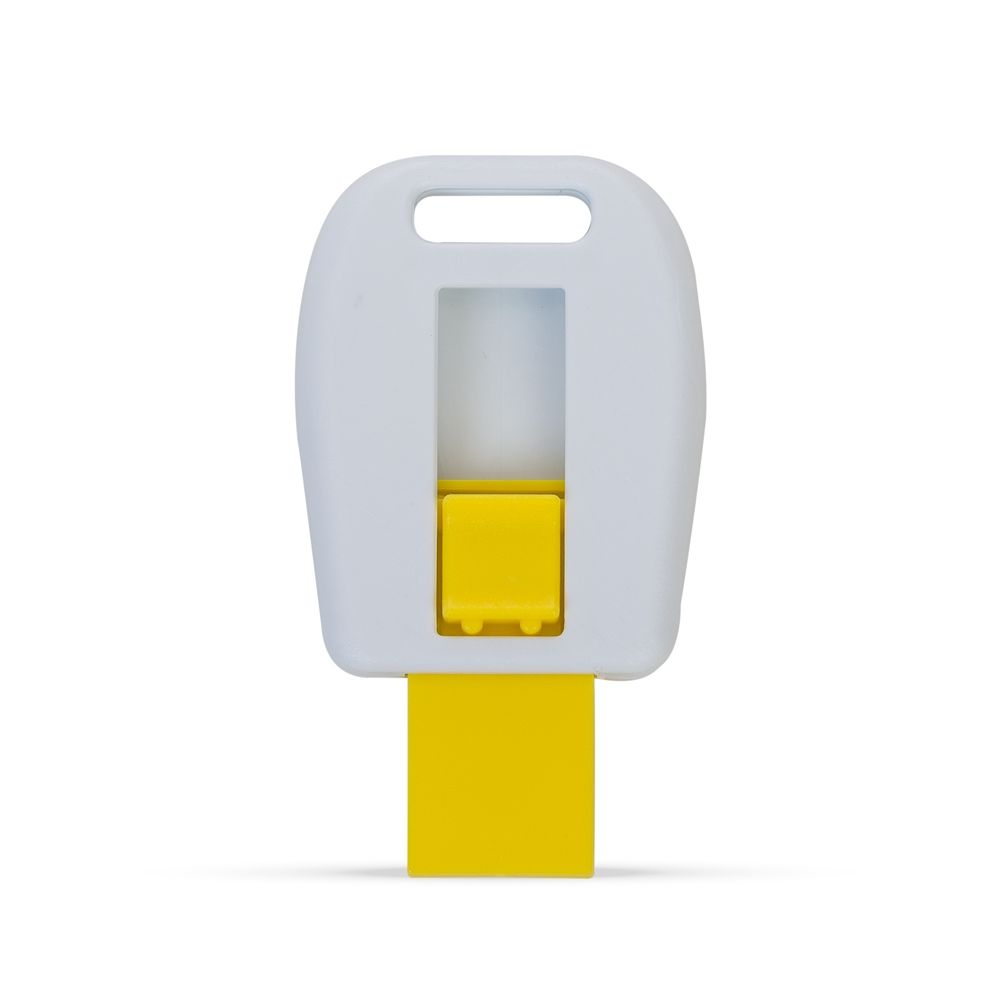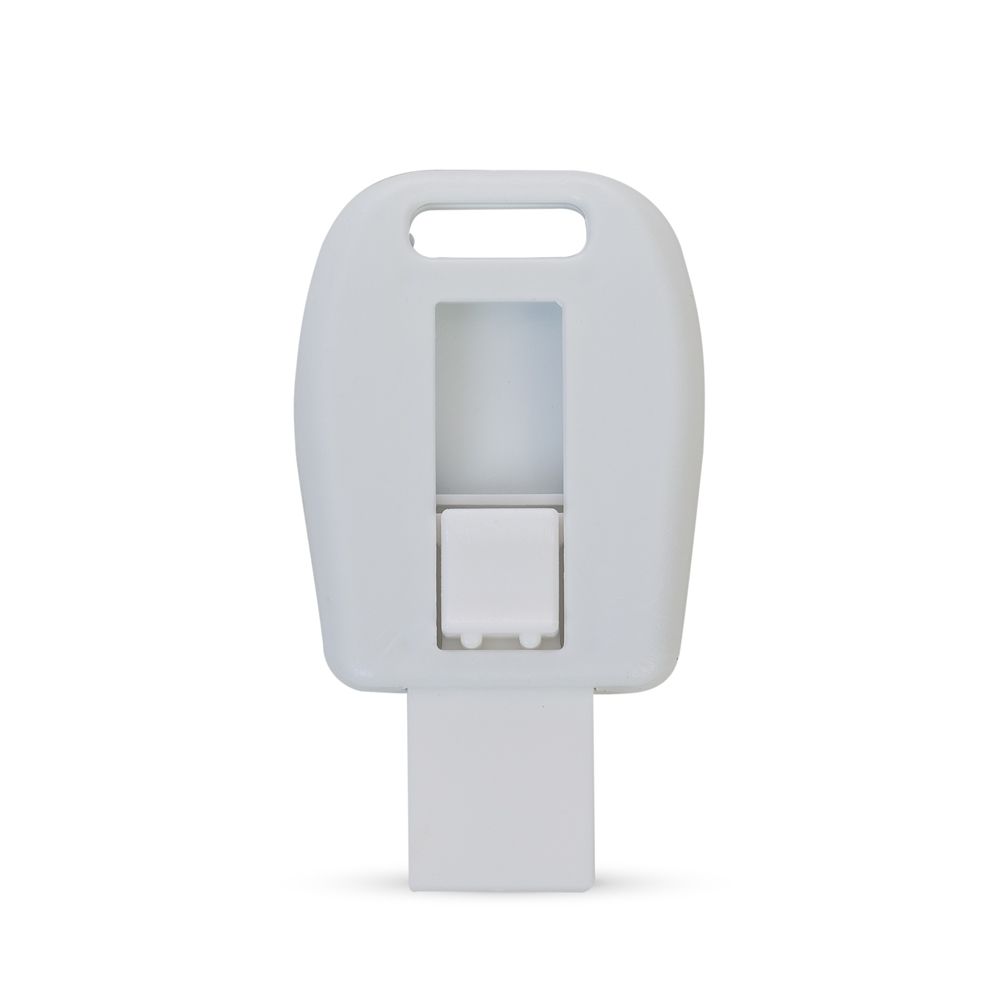Descrição: Carcaça retrátil plástica para memória COB. Possui parte superior vazada para encaixe de cordão/argola, botão/acionar colorido e verso com área lisa.