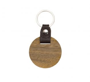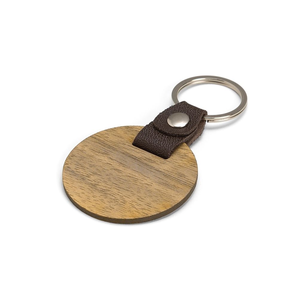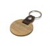 Descrição: Chaveiro ecológico circular em madeira clara com alça em couro.