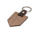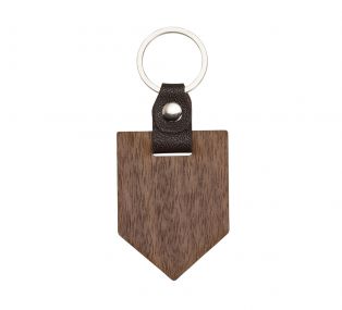 Descrição: Chaveiro ecológico formato flâmula em madeira escura com alça em couro.
