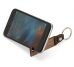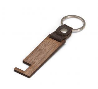 Descrição: Chaveiro ecológico porta celular em madeira escura com alça em couro.