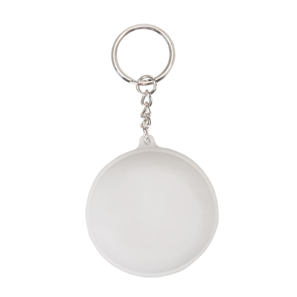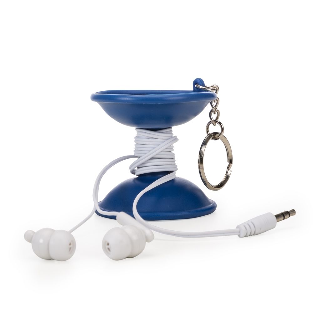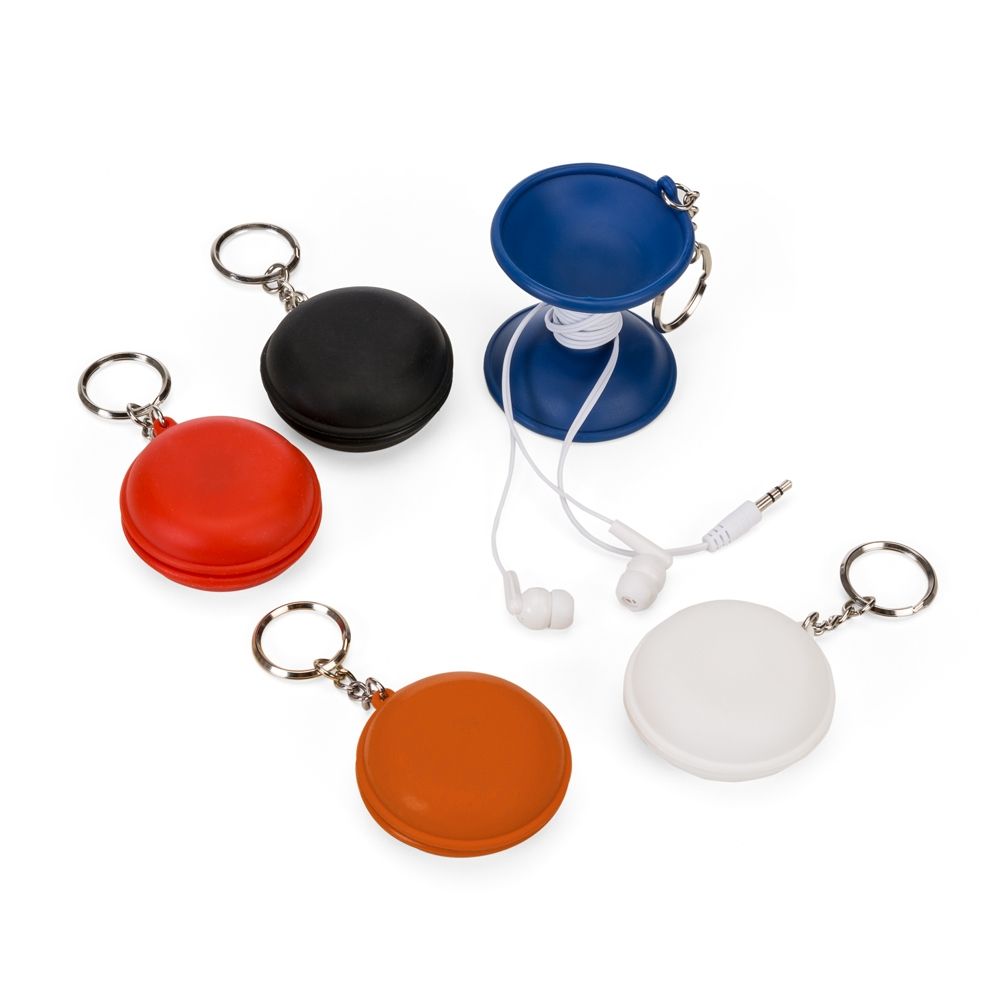 Descrição: Chaveiro emborrachado colorido com fone de ouvido estéreo. Chaveiro com formato de um “case”, possui na parte interna fone de ouvido intra auricular na cor branca.