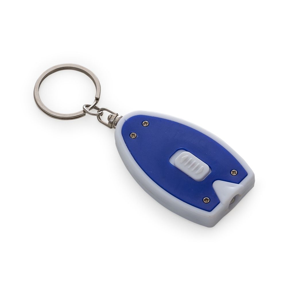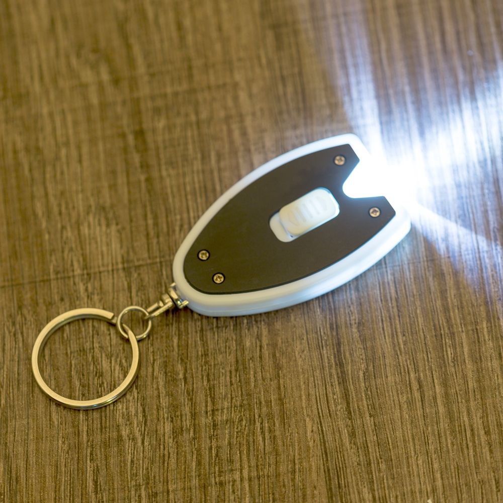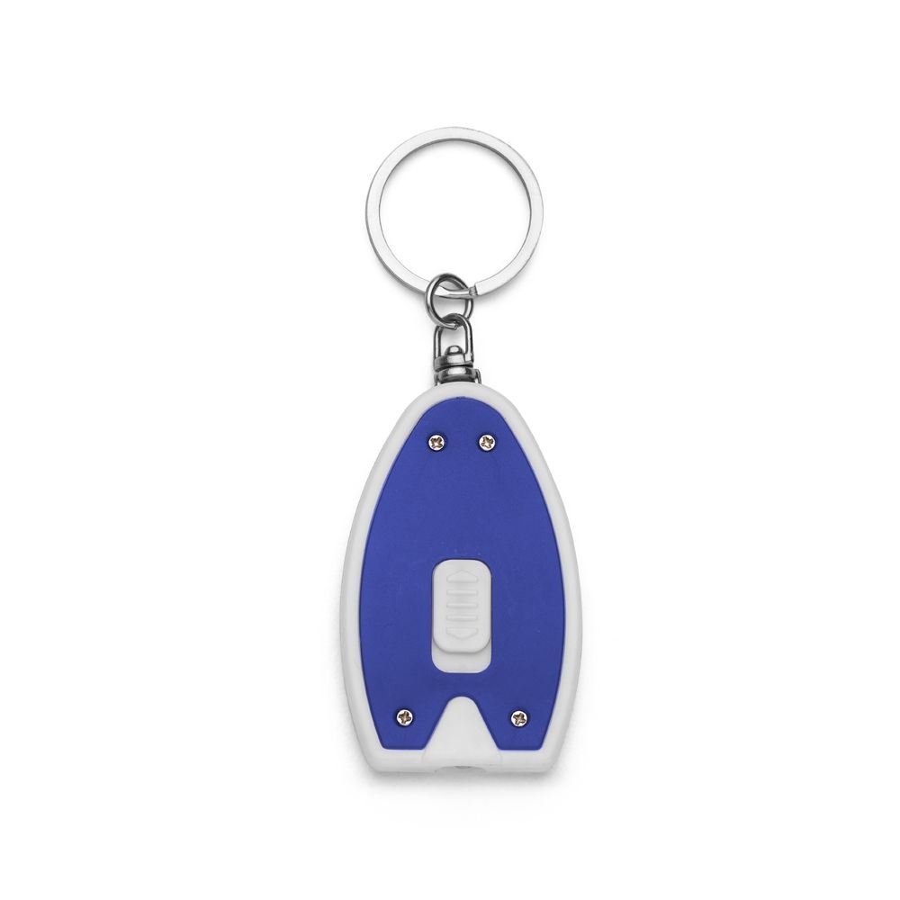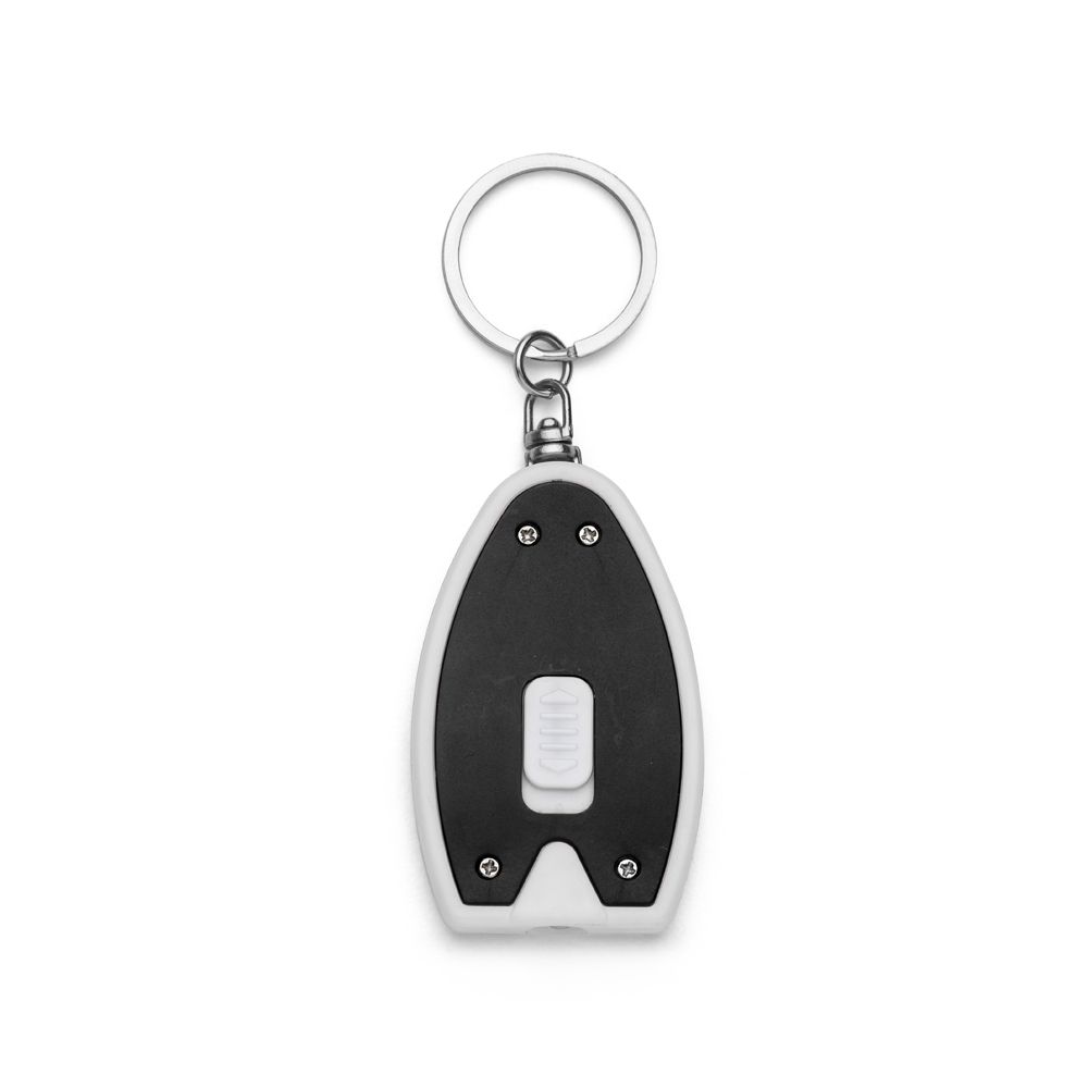 Descrição: Chaveiro lanterna de plástico colorido com detalhe branco. Possui um botão para ligar/desligar lanterna, acompanha 3 baterias AG1.