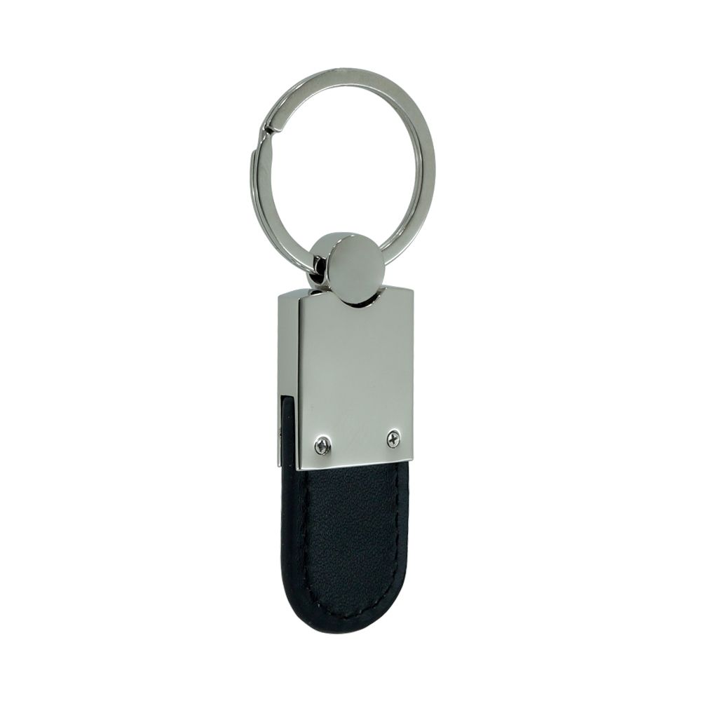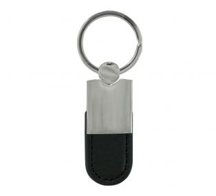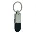 Descrição: Chaveiro metal brilhante com detalhe inferior em couro sintético. Suporte da argola giratório brilhante, frente do chaveiro lisa e verso com dois parafusos.