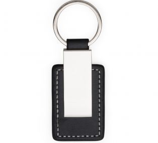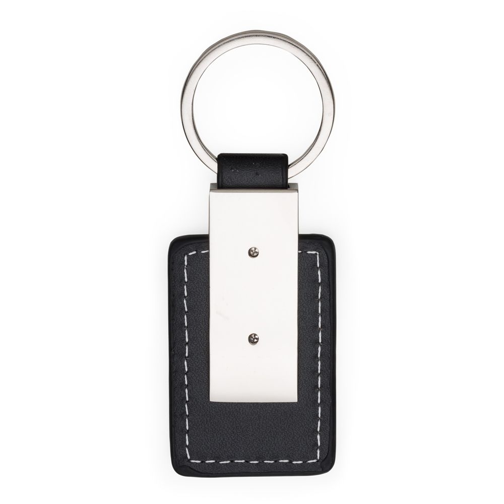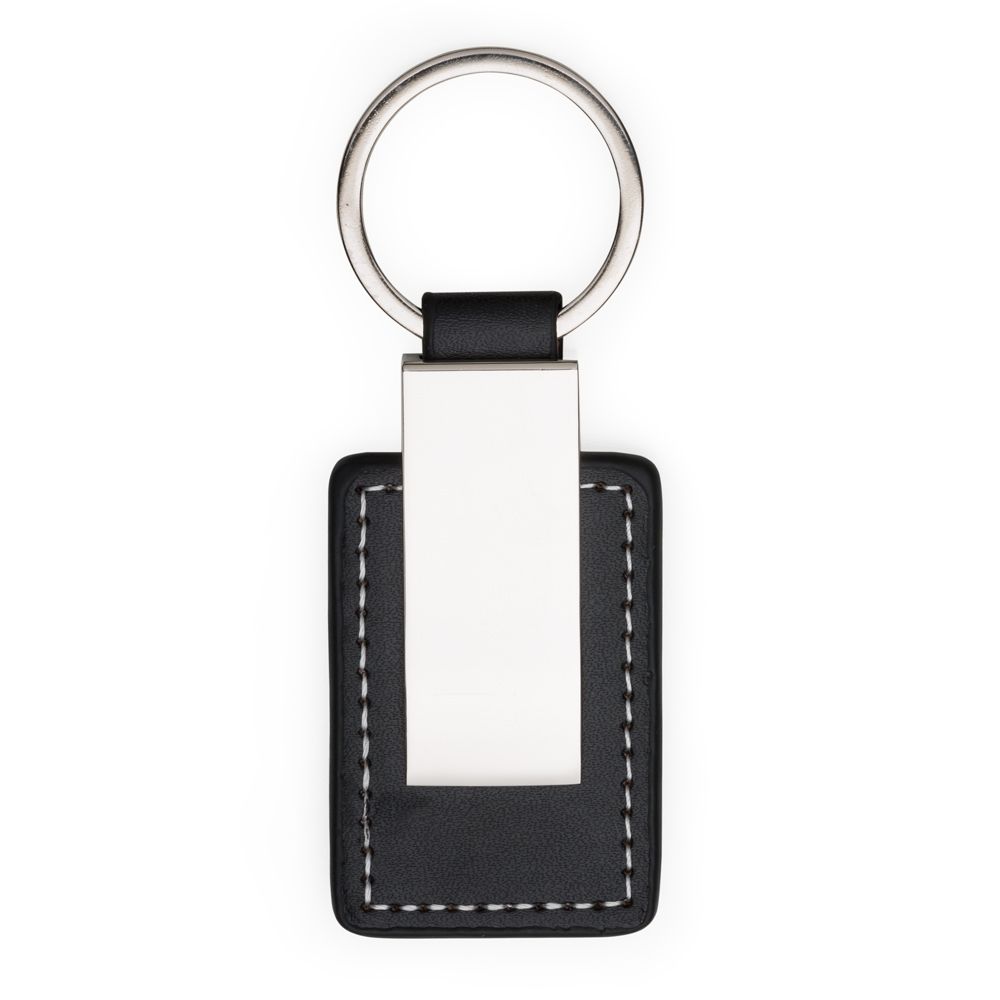 Descrição: Chaveiro metal retangular com detalhe em couro sintético com costura branca. Metal brilhante de frente lisa e verso com parafuso.