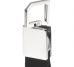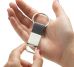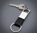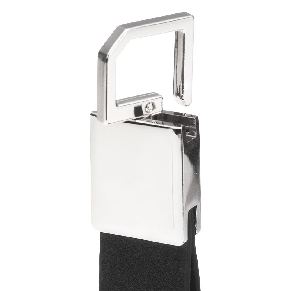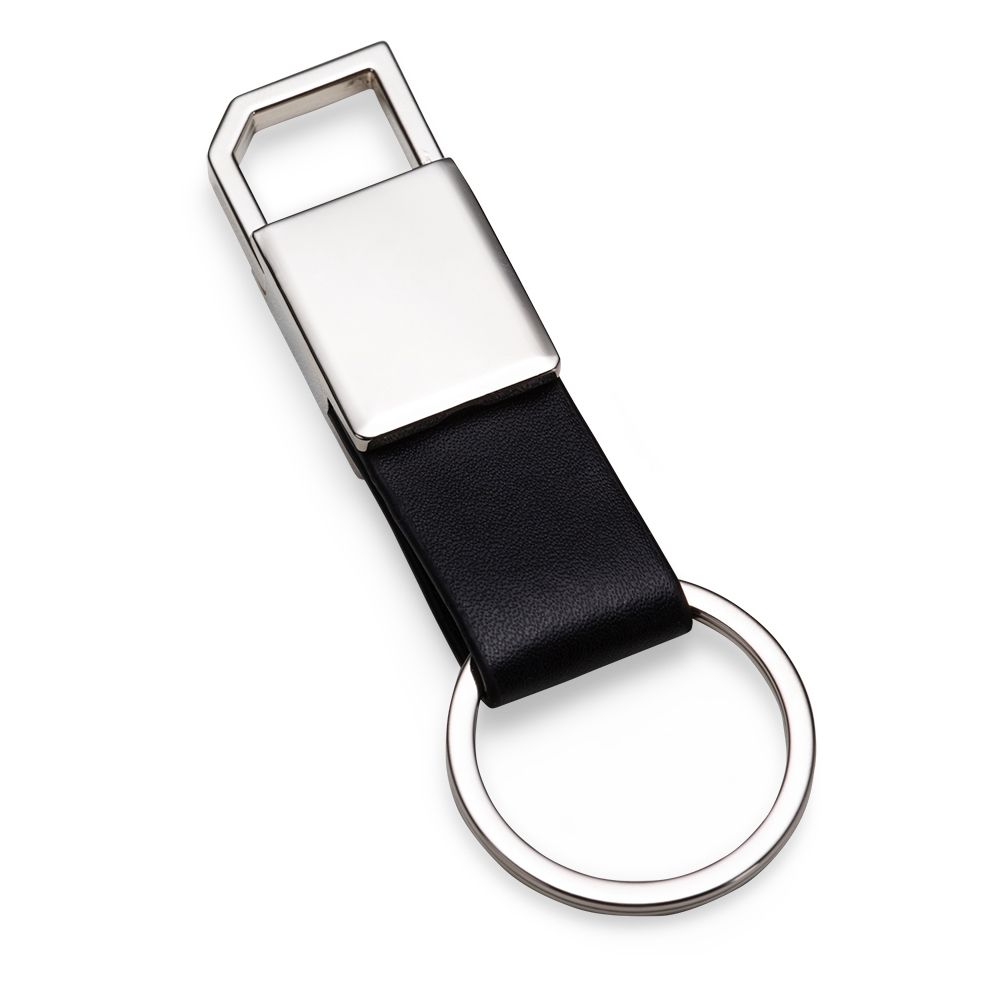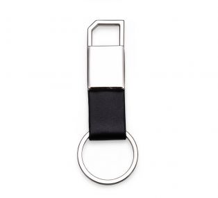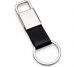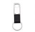 Descrição: Chaveiro metal com detalhe em couro sintético e mosquetão giratório. Frente lisa e parafusos no verso, “mosquetão” giratório, basta puxar para cima para rotacioná-lo.