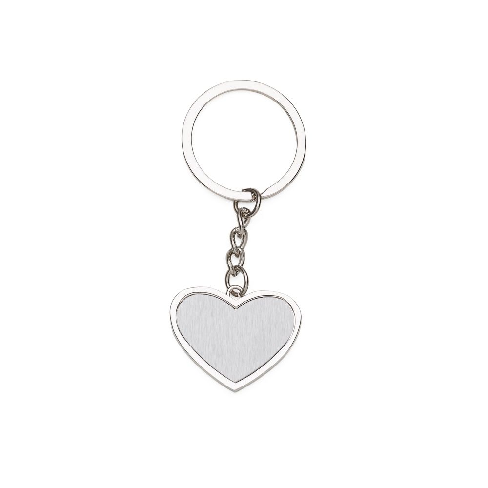 Descrição: Chaveiro metal formato coração com chapa central inox e verso liso brilhante. PEDIDO APENAS MÚLTIPLO DE 75 PEÇAS!