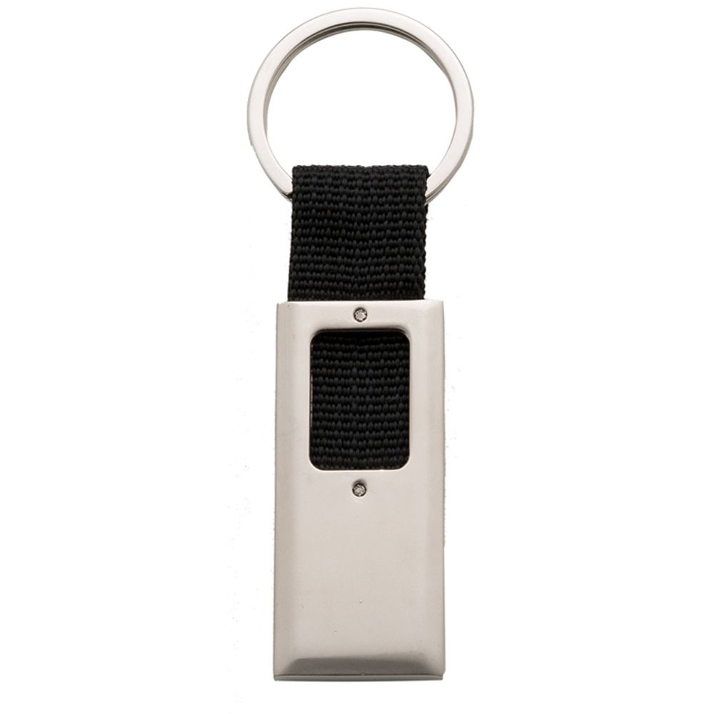 Descrição: Chaveiro metal fosco retangular, centro vazado com detalhe em nylon. Frente lisa e verso com detalhe de parafusos.