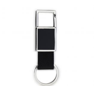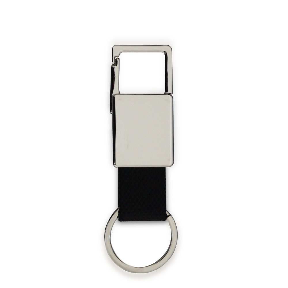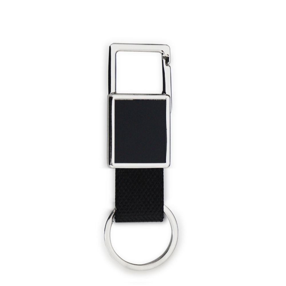 Descrição: Chaveiro de metal com mosquetão. Chaveiro metálico com chapa central de alumínio na cor preta e verso liso brilhante, possui alça de nylon. Mosquetão sem trava.
