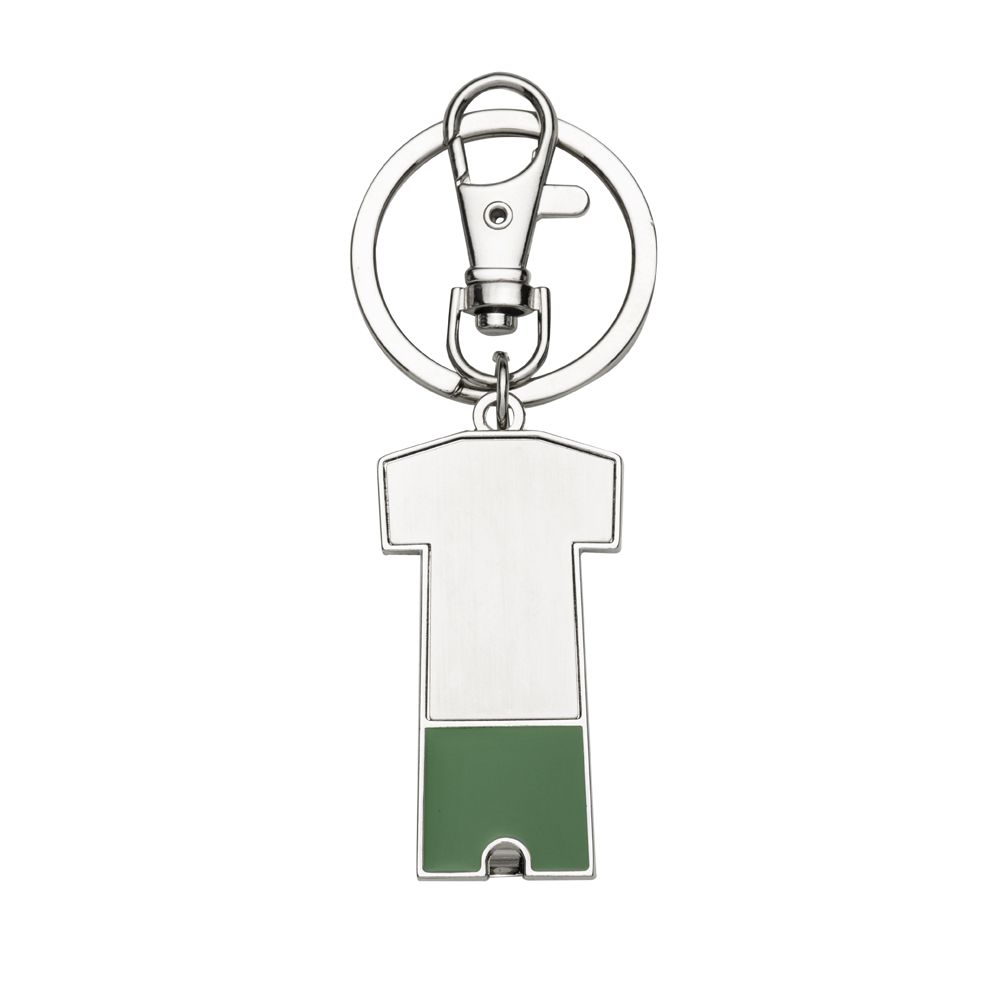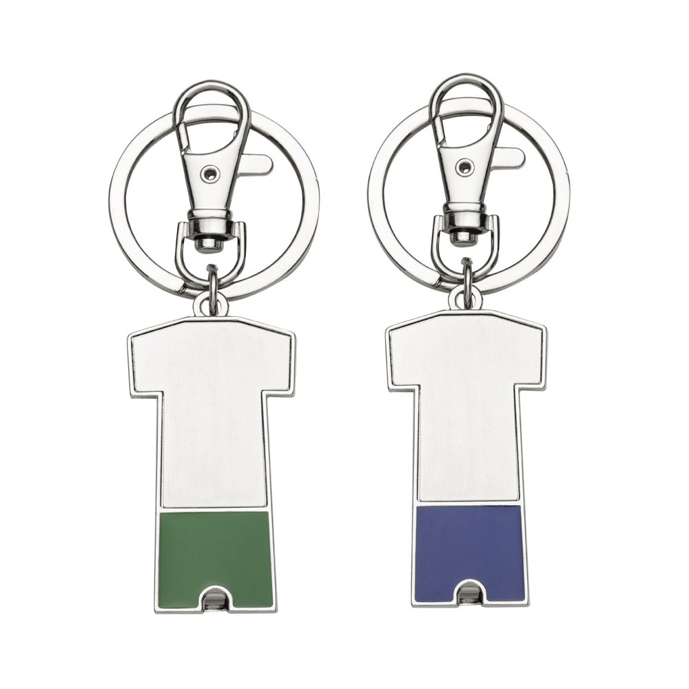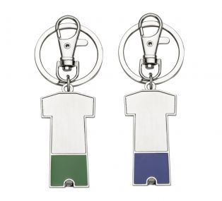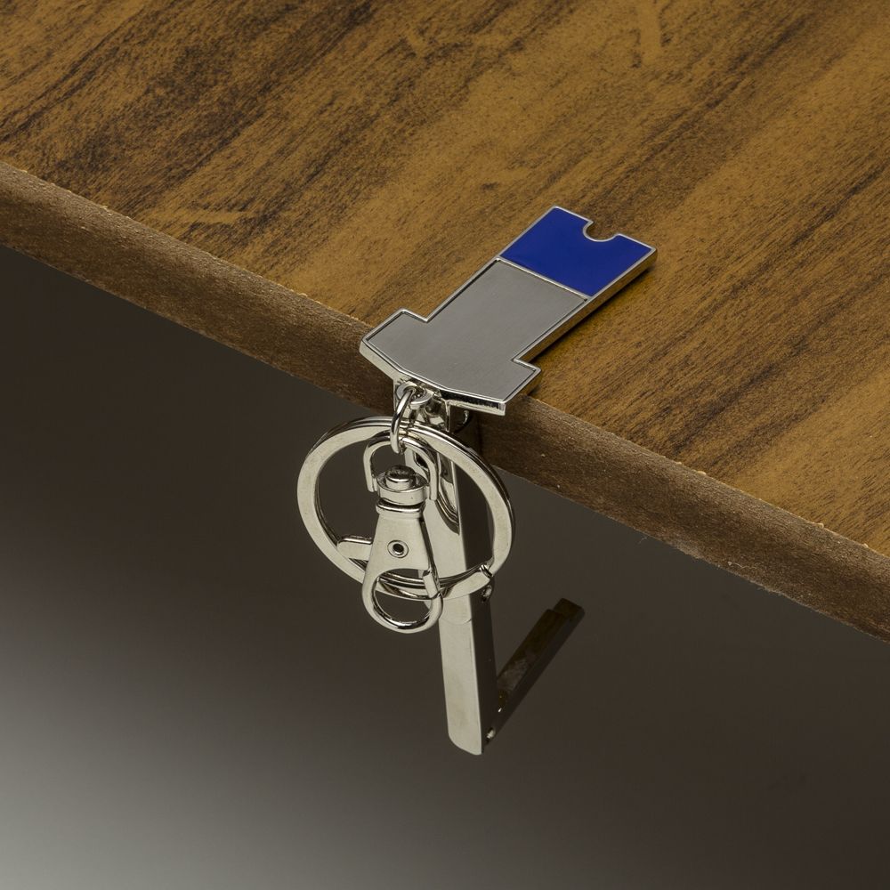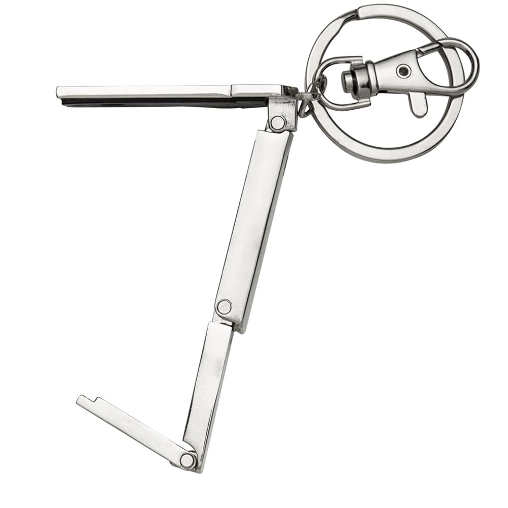 Descrição: Chaveiro metal porta bolsa dobrável formato uniforme. Parte traseira com borracha anti deslizante, possui além do chaveiro um gancho prendedor. Para utilizar o porta bolsa basta puxar o compartimento traseiro(é imantado) e abri-lo.