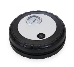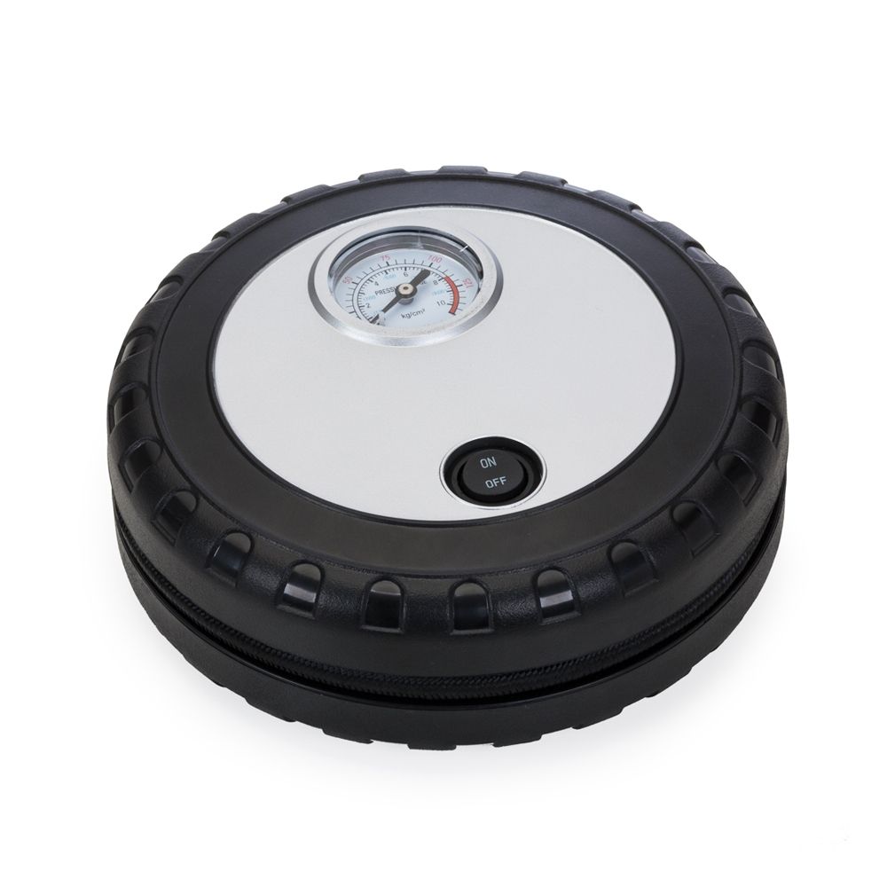 Compressor de ar portátil 12V formato pneu. Material plástico resistente, parte central superior em prata com medidor de pressão(possui botão de on/off), válvula lateral, tomada para carro e 3 adaptadores para inflar bolas, bóias e pneus. Modo de utilizar: encaixar a válvula do compressor na válvula de ar do pneu(certificar-se de que o trinco dourado do polegar esteja travado) e deslize firmemente para dentro da ponta da válvula. Conecte o adaptador no local de isqueiro do carro(alguns carros precisam estar ligados para que tenha energia no adaptador do isqueiro). É necessário que o compressor esteja em um superfície plana, sempre monitore o compressor enquanto o pneu está sendo bombeado, verifique a pressão do ar no compressor(consulte o manual do pneu/proprietário para verificar qual a pressão recomendada) e quando o medidor atingir a pressão recomendada, apague o compressor. Se o compressor estiver funcionando há mais de 10 minutos, desligue e deixe esfriar para evitar o superaquecimento.