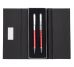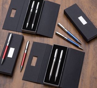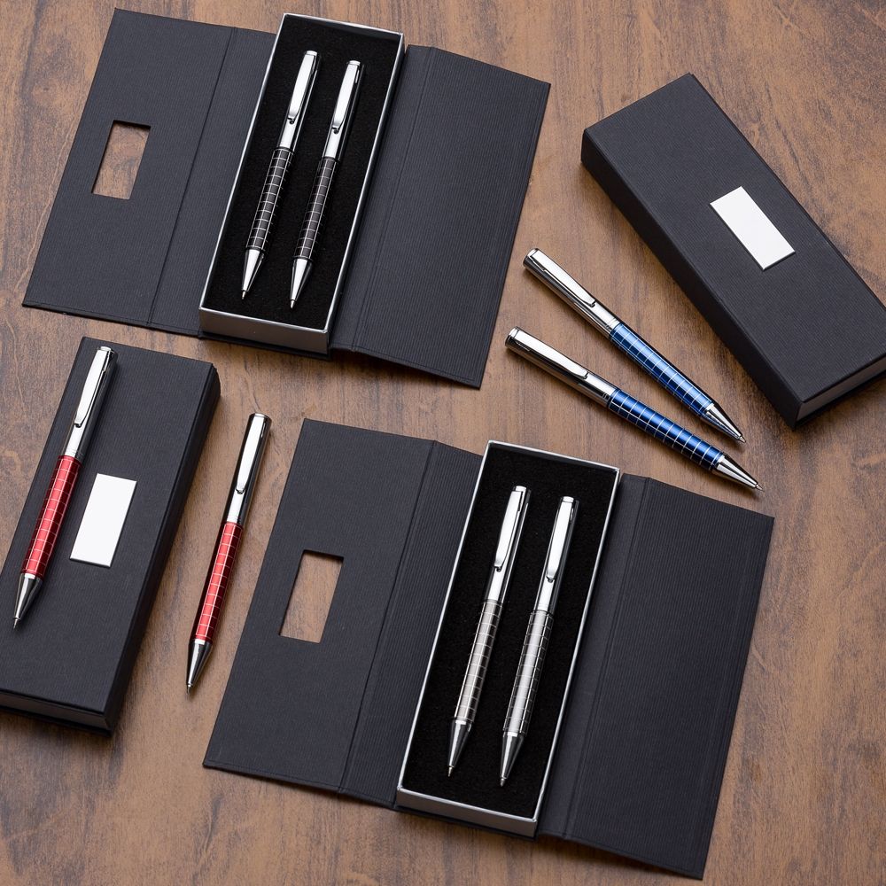 Descrição: Kit caneta e lapiseira de metal em estojo papelão com placa de metal(parte interna do estojo revestida com espuma). Caneta e lapiseira prata com detalhes coloridos e quadriculados, clip metal com anel superior na ponta e dois anéis centrais e acionam por giro.