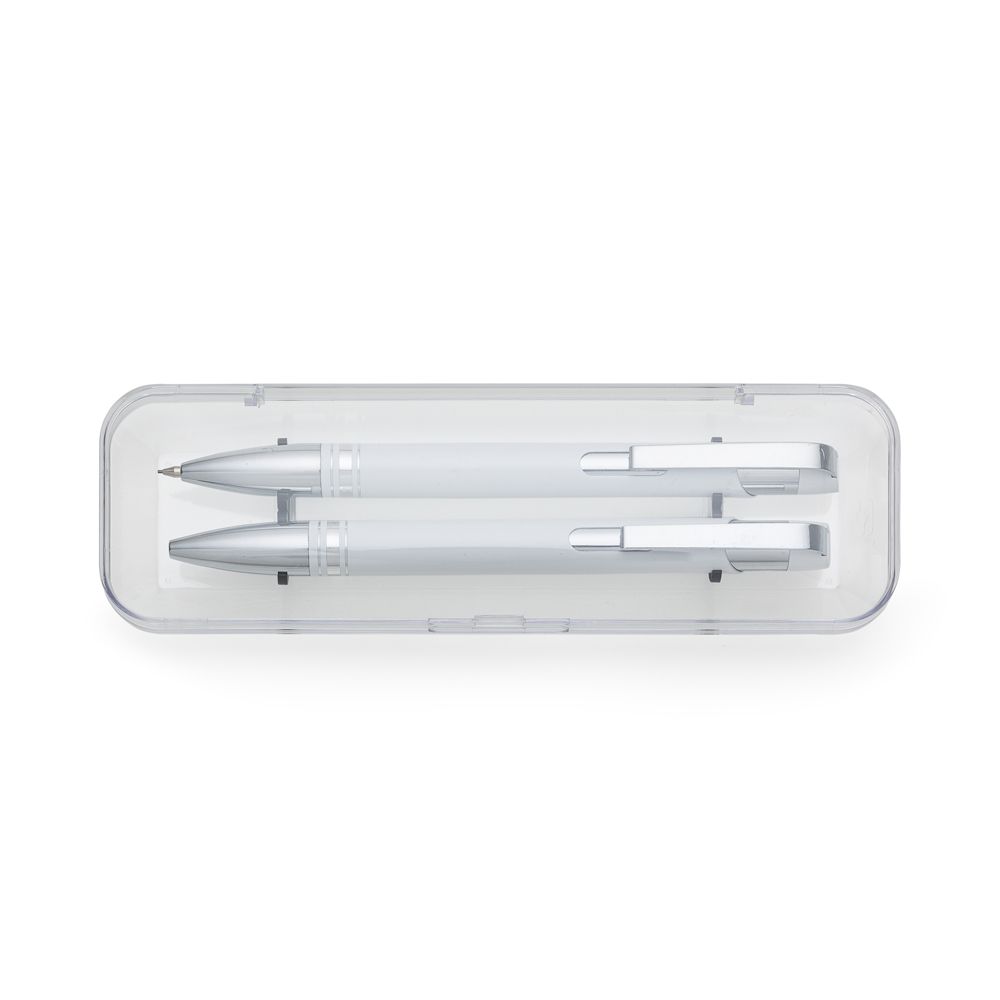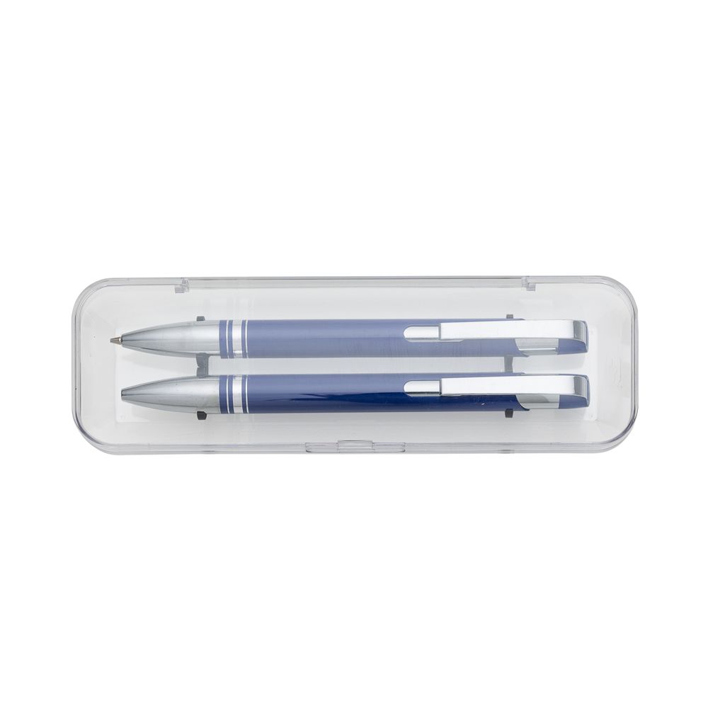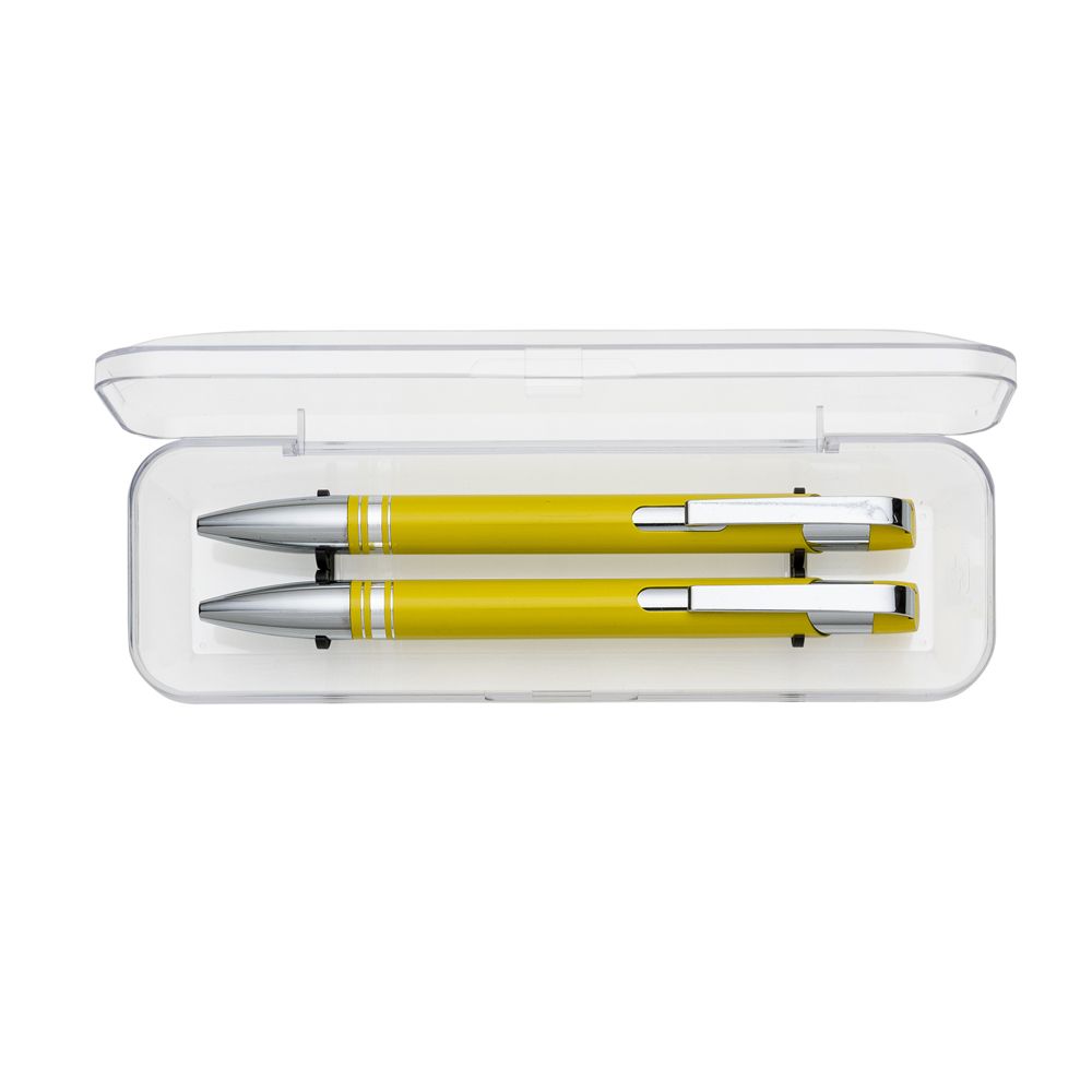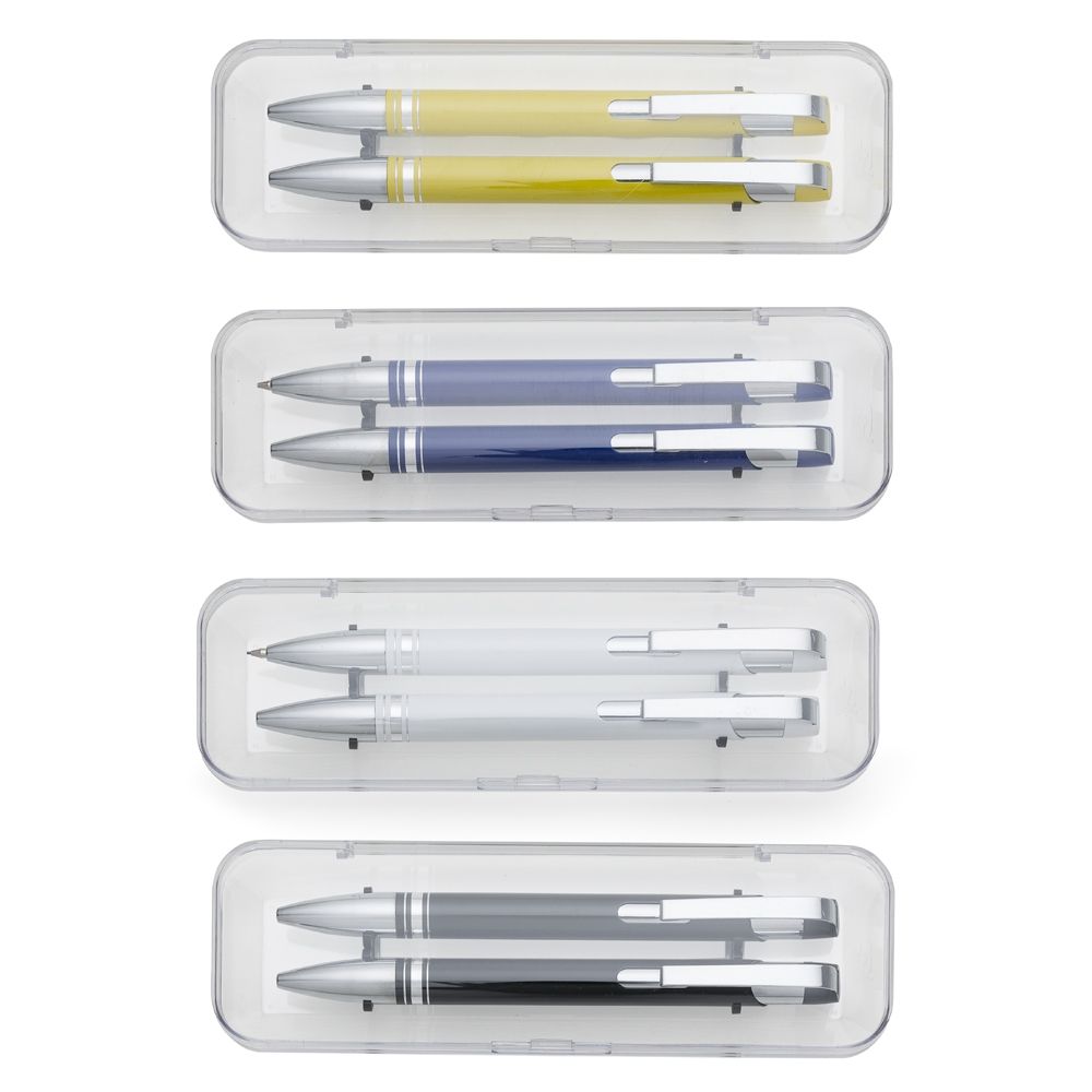 Descrição: Conjunto caneta e lapiseira semimetal e estojo acrílico. Estojo com encaixes interno(apenas a parte central plana), caneta e lapiseira semimetálicas inteiras coloridas com detalhes prata(acionadas por clique), clip de metal e possui 3 anéis na parte inferior. OBS.: PEDIDO APENAS MÚLTIPLO DE 50 PEÇAS!