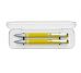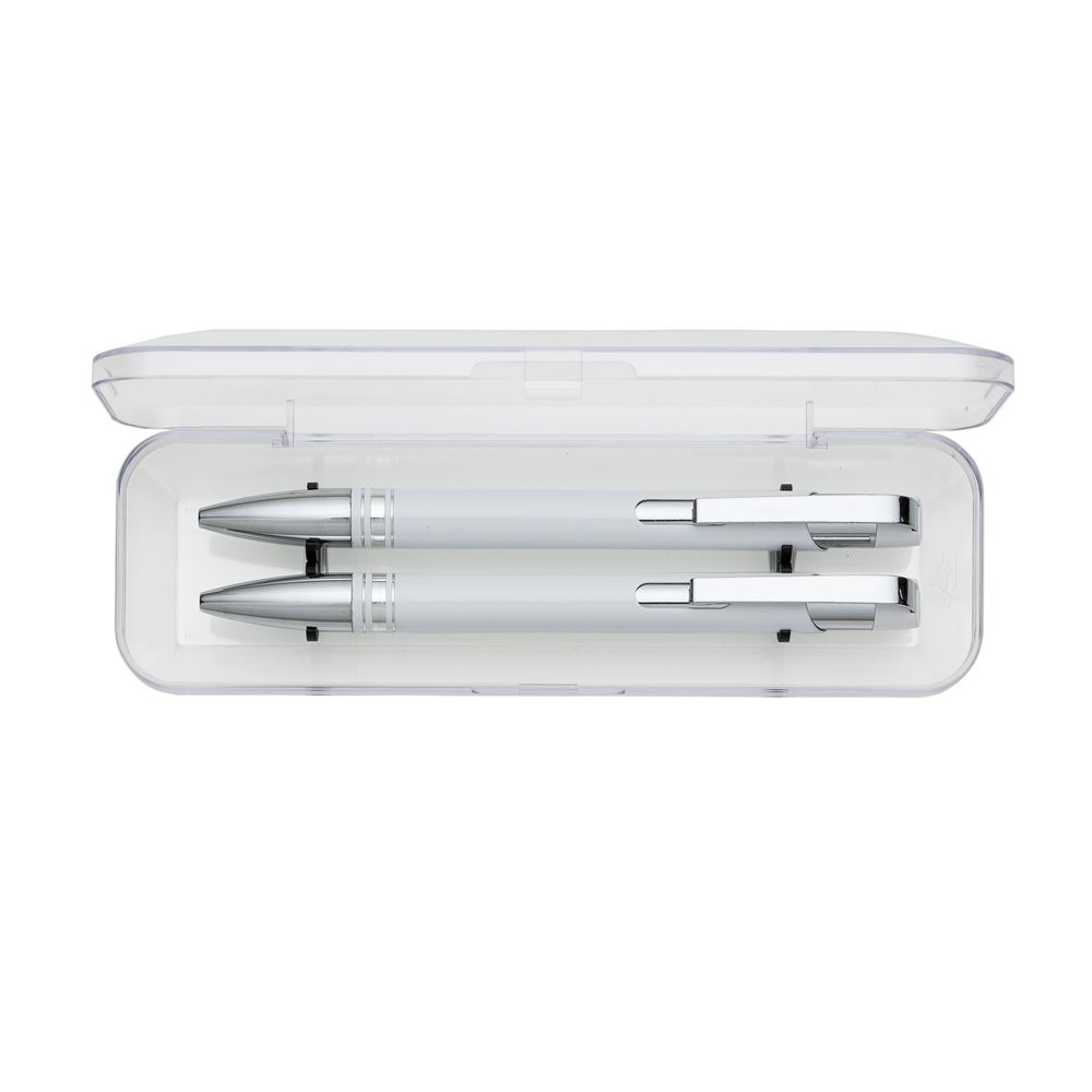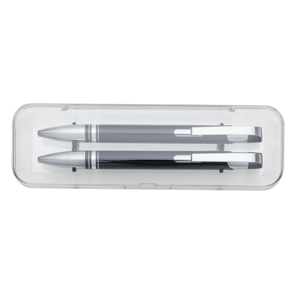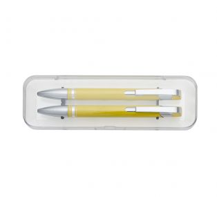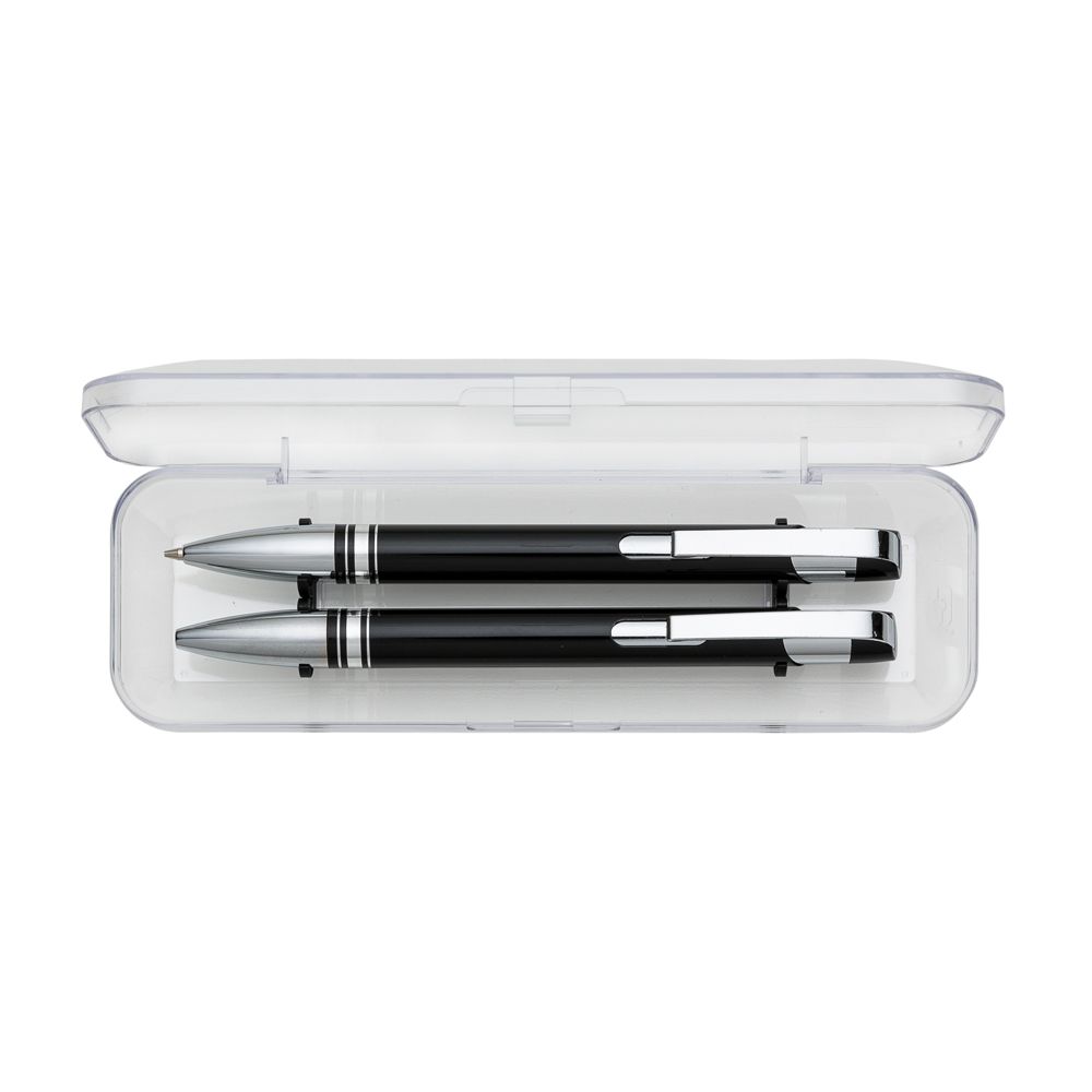 Descrição: Conjunto caneta e lapiseira semimetal e estojo acrílico. Estojo com encaixes interno(apenas a parte central plana), caneta e lapiseira semimetálicas inteiras coloridas com detalhes prata(acionadas por clique), clip de metal e possui 3 anéis na parte inferior. OBS.: PEDIDO APENAS MÚLTIPLO DE 50 PEÇAS!