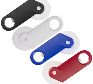 Descrição: Cortador de pizza e abridor de garrafas em plástico resistente. Cortador branco e corpo colorido, possui abridor prata no parte inferior.