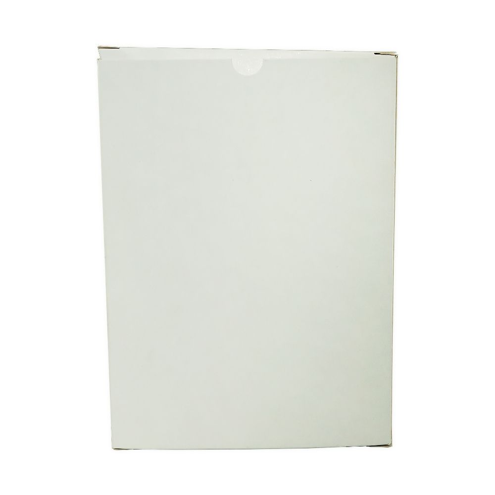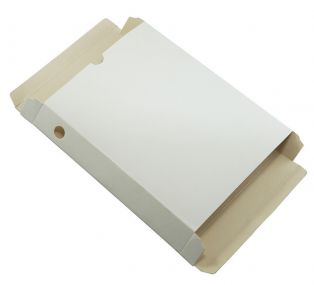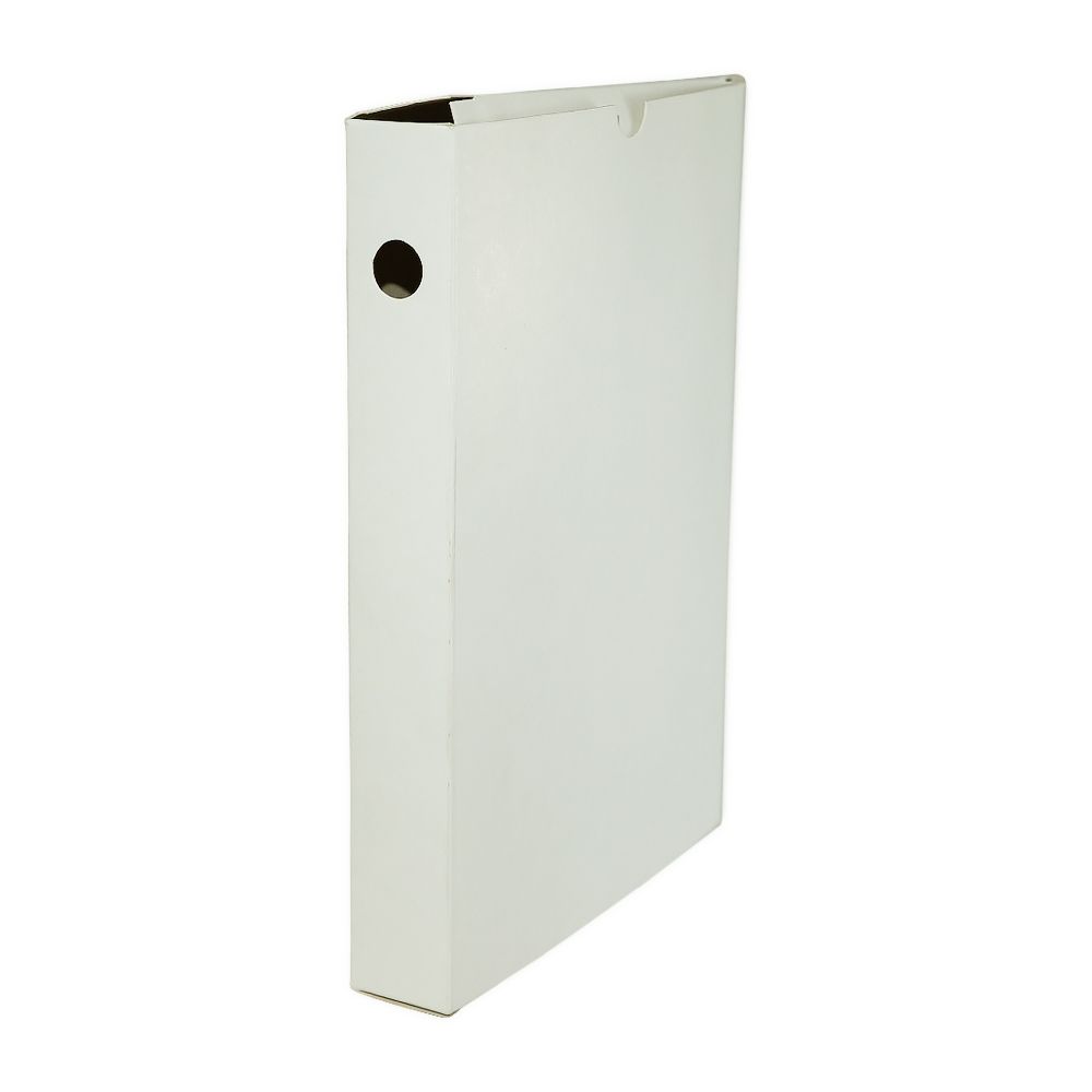 Descrição: Embalagem de papelão para agenda, caixinha branca lisa com um furo na lateral.