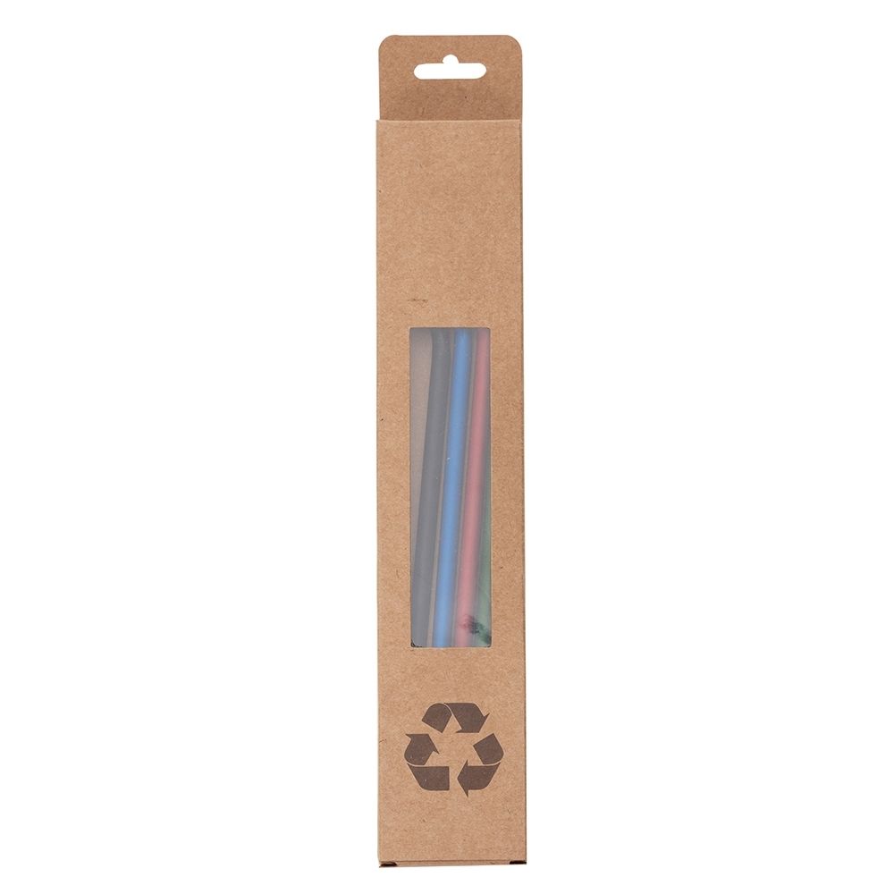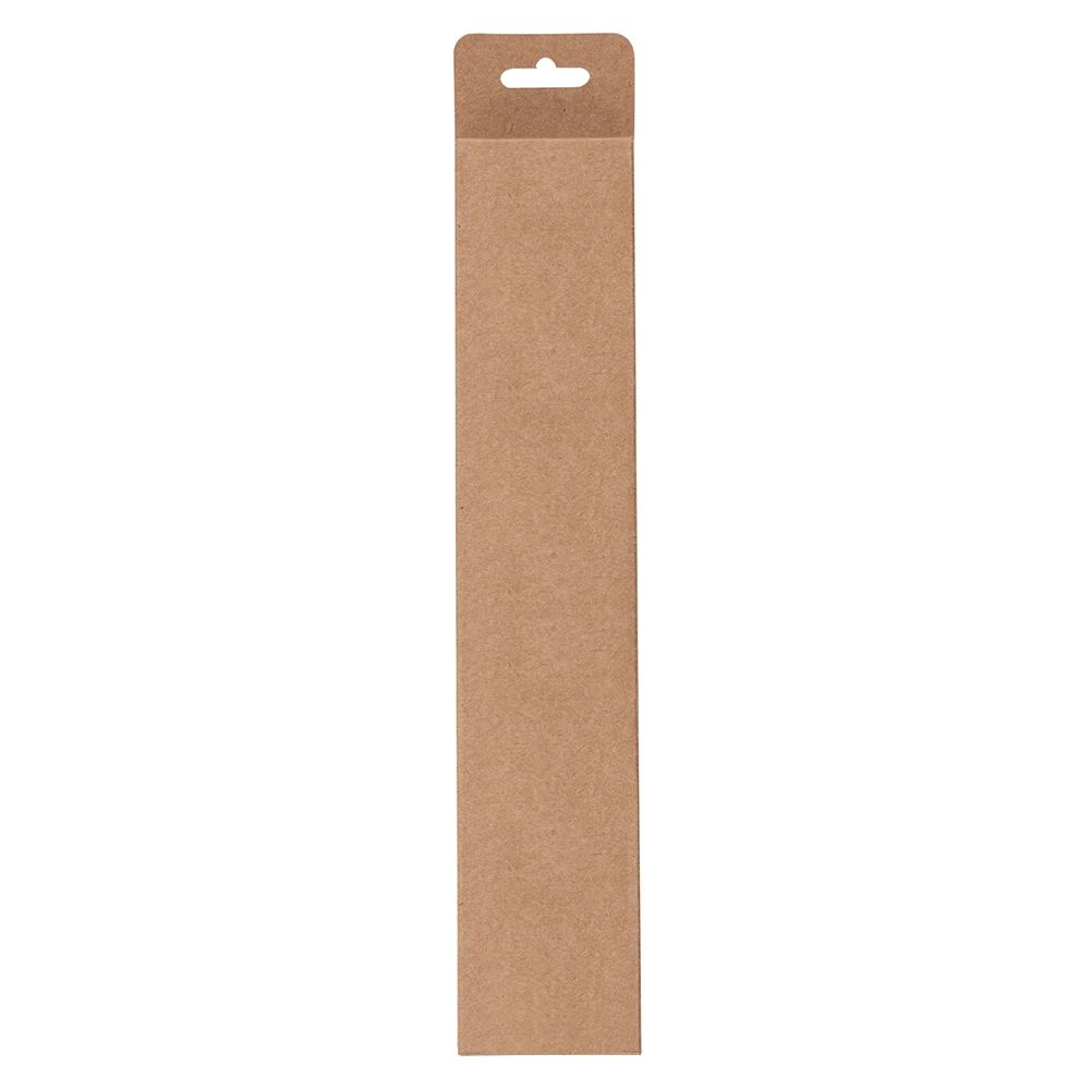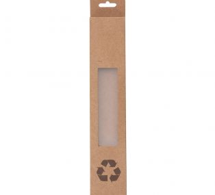 Descrição: Embalagem kraft para canudos, possui visor plástico e símbolo reciclável na parte frontal.