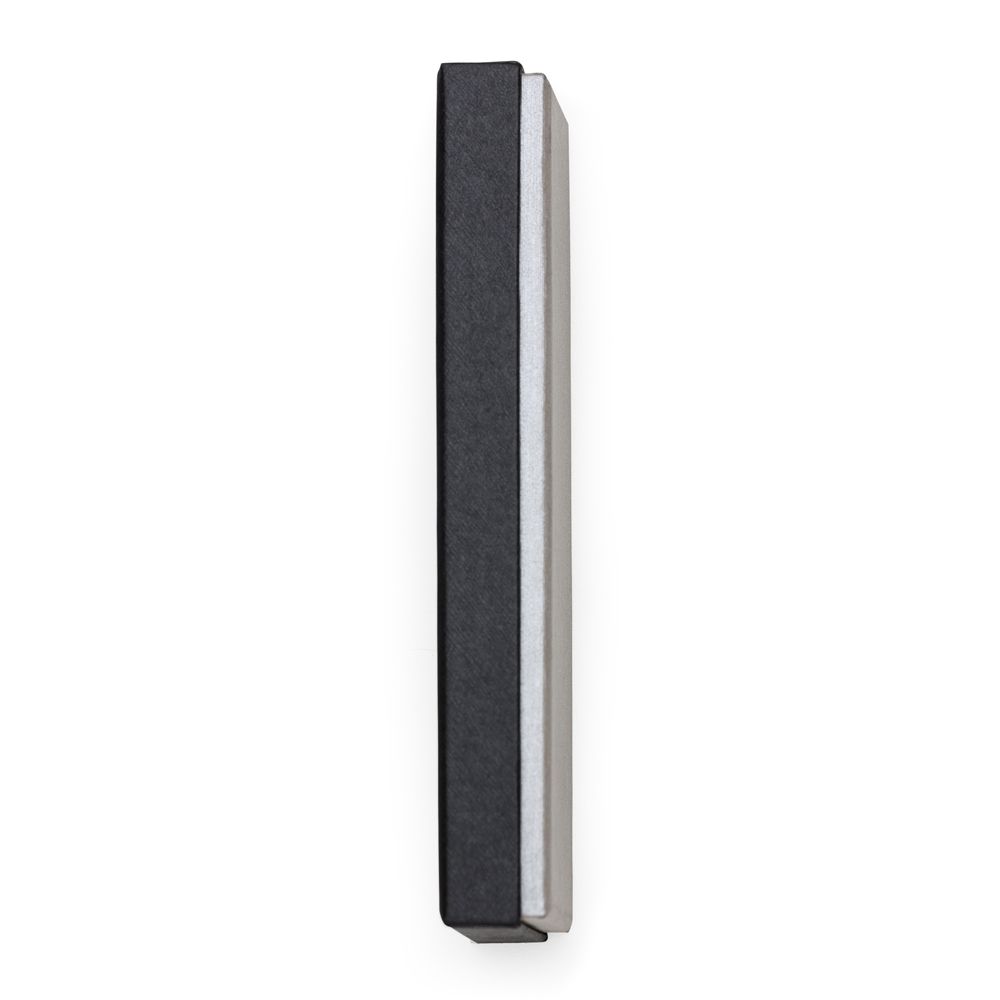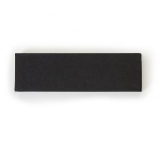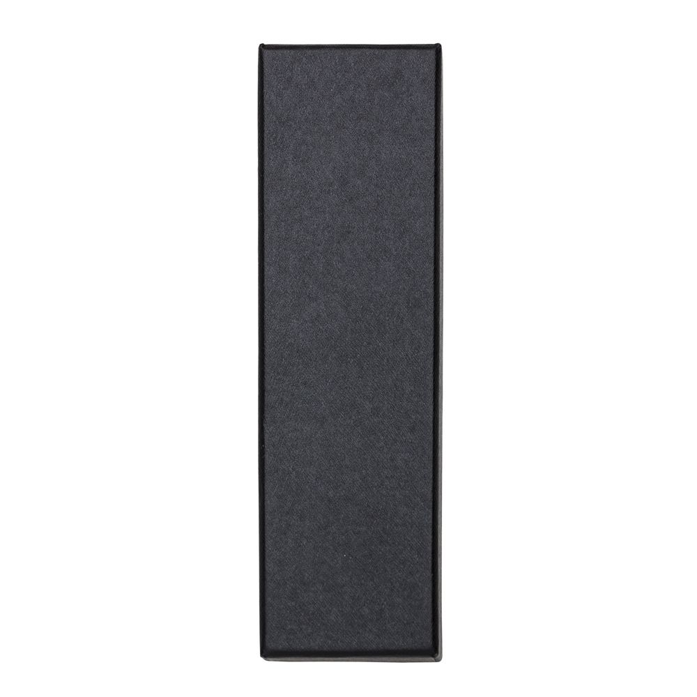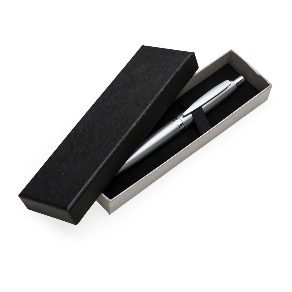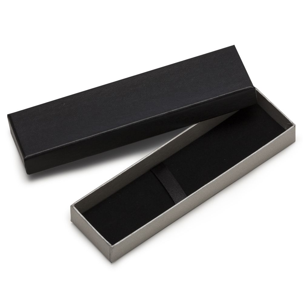 Descrição: Estojo de papelão para uma caneta, tampa preta e “base” prata. Parte interna revestida com veludo e possui elástico para fixar a caneta. OBS.: PEDIDO APENAS MÚLTIPLO DE 50 PEÇAS!