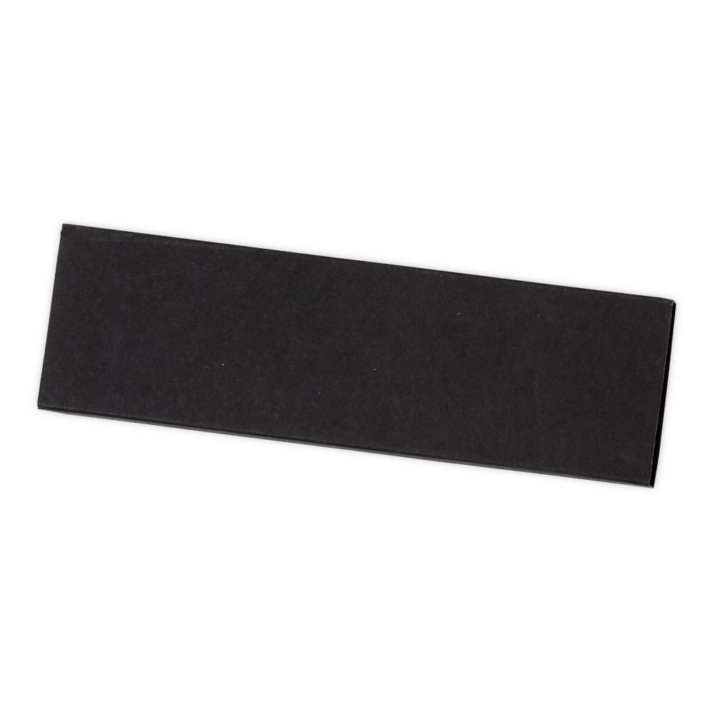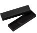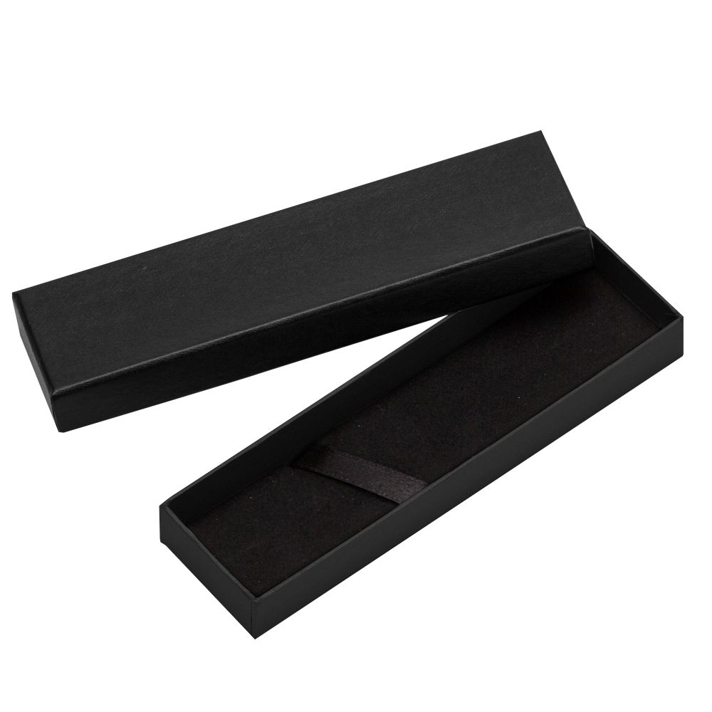 Descrição: Estojo de papelão para uma caneta com, tampa preta. Parte interna revestida com veludo e possui fita de cetim para fixar a caneta.