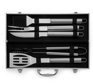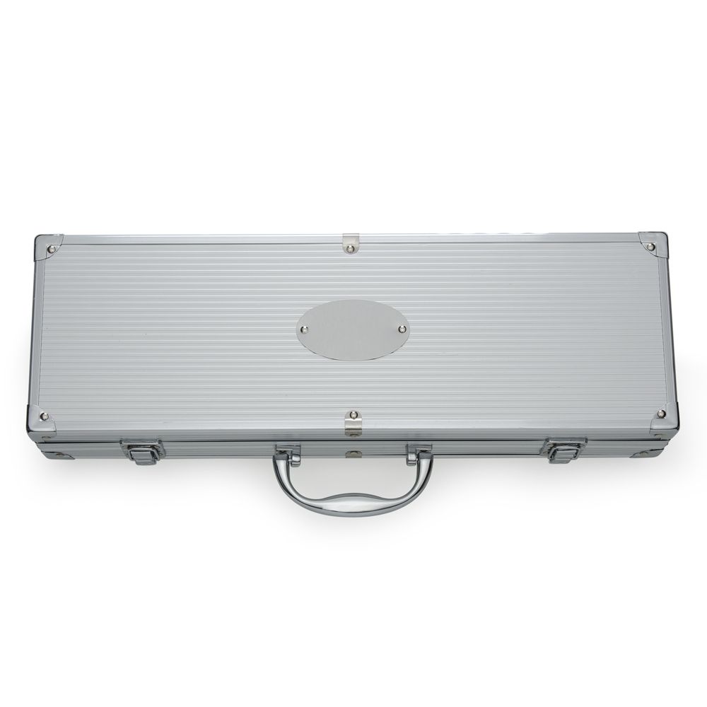 Descrição: Kit churrasco 5 peças em maleta de alumínio com relevo. Possui: espátula, pegador, faca, garfo e escova para limpeza(acompanha protetor plástico) em inox detalhes em metal nas bordas da maleta, duas dobradiças na parte inferior, uma alça e duas presilhas para travar/abrir maleta. Parte interna revestida de tecido tnt e velcro para guardar as peças.