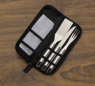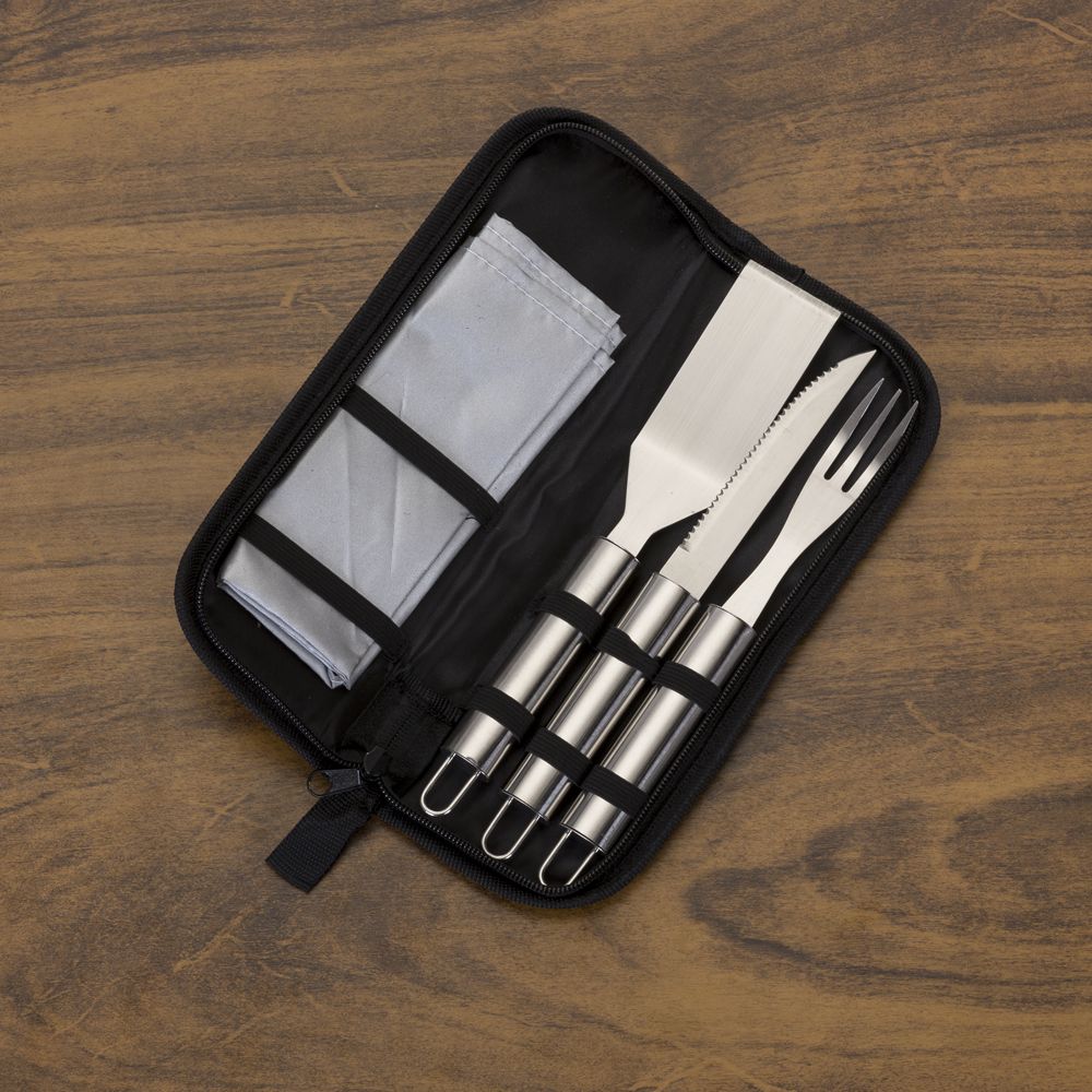 Descrição: Kit churrasco com 5 peças em estojo de nylon com alça. Possui: 2 jogos americanos, espátula, faca e garfo. Acompanha proteções plásticas e parte interna com elástico para guardar as peças.