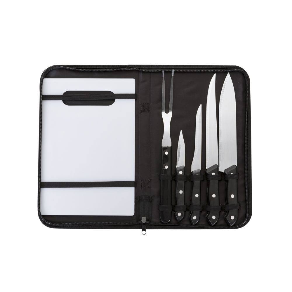 Descrição: Kit churrasco 6 peças em estojo de nylon com alça. Contém tábua plástica, garfo e 4 modelos de faca em tamanhos diferentes. Estojo com elástico na parte interna para fixar os talheres.