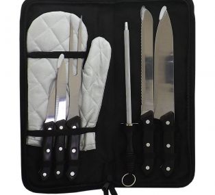 Descrição: Kit churrasco 7 peças em estojo de nylon com alça. Possui: faca para legumes, faca para desossar, garfo, luva, amolador, faca com serra e faca peixeira. As peças acompanham proteção plástica e parte internado estojo com velcro para guardar as peças.
