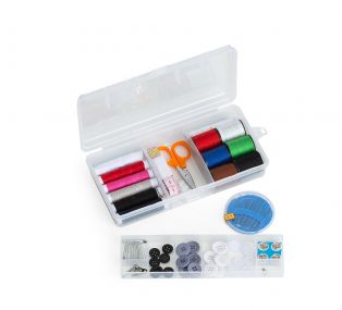 Descrição: Kit costura em estojo plástico, possui bandeja com 10 alfinetes com gancho, colchete com gancho, jogo de botões, botões de pressão, colchetes, conjunto de linhas, conjunto de agulhas, passa fio, mini tesoura, fita métrica 150cm e conjunto carretéis de linhas.