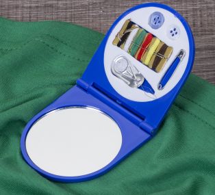 Descrição: Kit costura plástico com espelho. Parte interna revestida com espuma, possui: passador de linha, conjunto com seis linhas coloridas, duas agulhas, dois botões e um alfinete.
