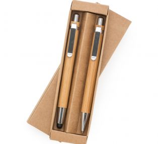 Descrição: Kit ecológico caneta e lapiseira em bambu com estojo de papelão. Caneta bambu com clip metálico e possui borracha touch na parte inferior, quando aciona a esferográfica(clique) ela sai através do touch. Lapiseira bambu com clip metálico, aciona por clique.