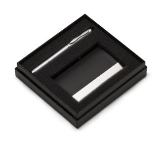 Descrição: Kit executivo com 2 peças em estojo preto de papelão revestido com espuma interna. Possui uma caneta metal esfero laser e lanterna, clip metal e ao lado desenhos indicativos referente as funções, contém dois anéis prata, sendo o primeiro ao desrosquear fica o compartimento das baterias(acompanha 3 baterias CNB G3A) e o segundo anel é uma tampa com ponta touch, basta puxá-la para utilizar a caneta esfero. Porta cartão em couro sintético com detalhes em metal espelhado, parte interna revestida com veludo.