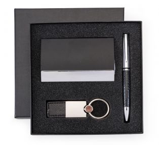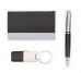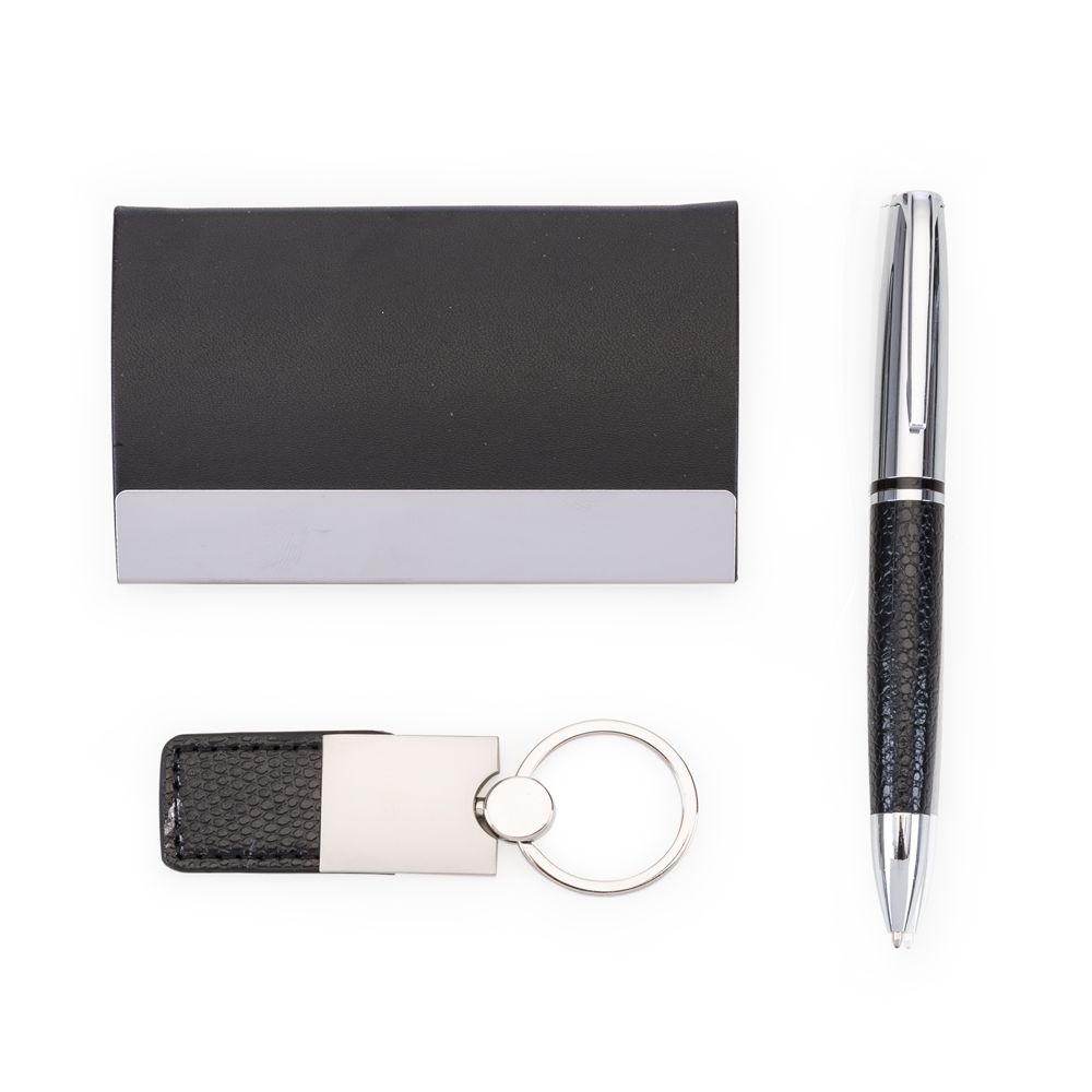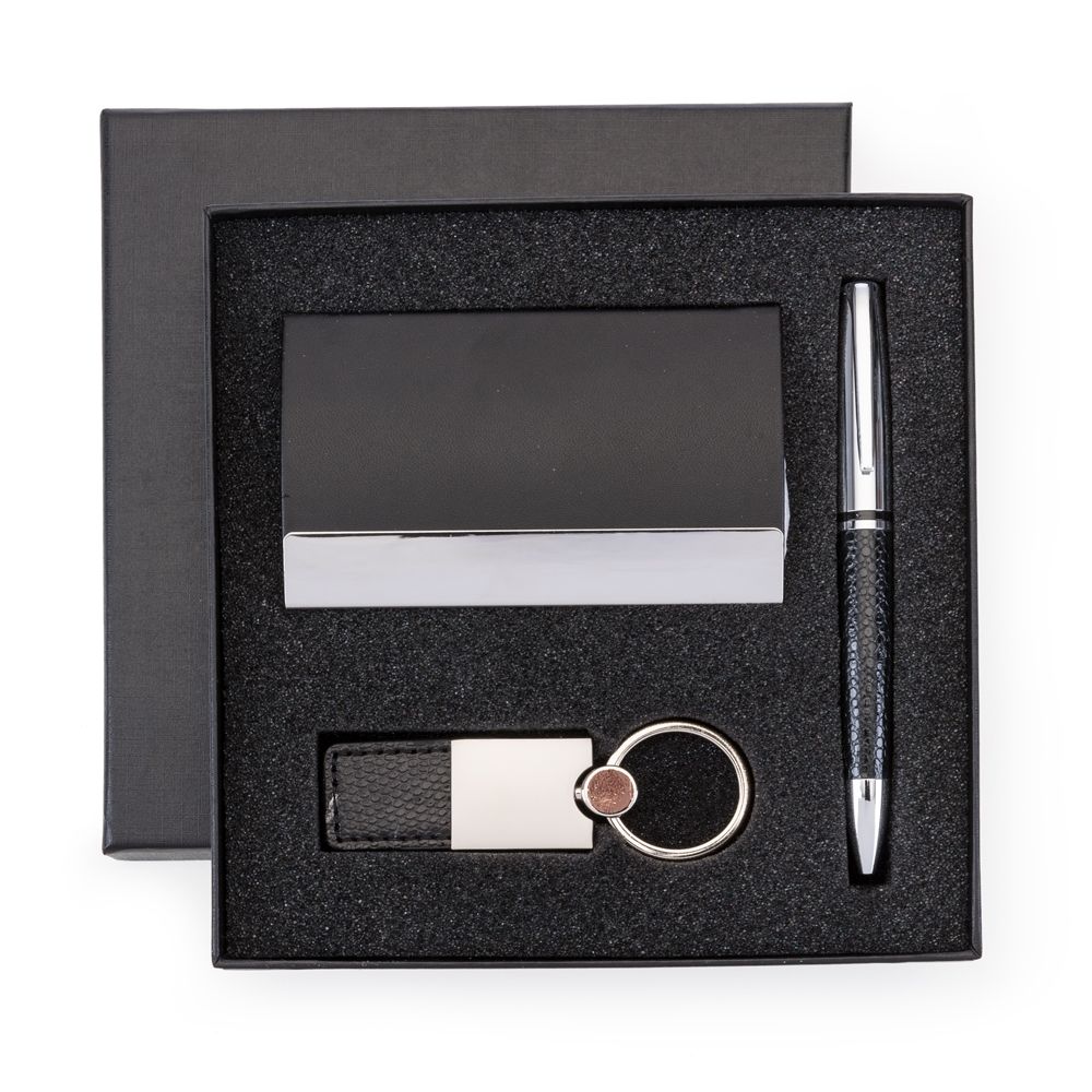 Descrição: Kit executivo com 3 peças em estojo preto de papelão revestido com espuma interna. Possui: caneta metal brilhante com detalhe couro sintético preto, clip metal e anel central preto(aciona por giro); porta cartão em couro sintético liso com detalhes metálicos brilhantes(parte interna com veludo) fecha por imã; chaveiro metal fosco com detalhe inferior emborrachado(suporte da argola giratório brilhante).