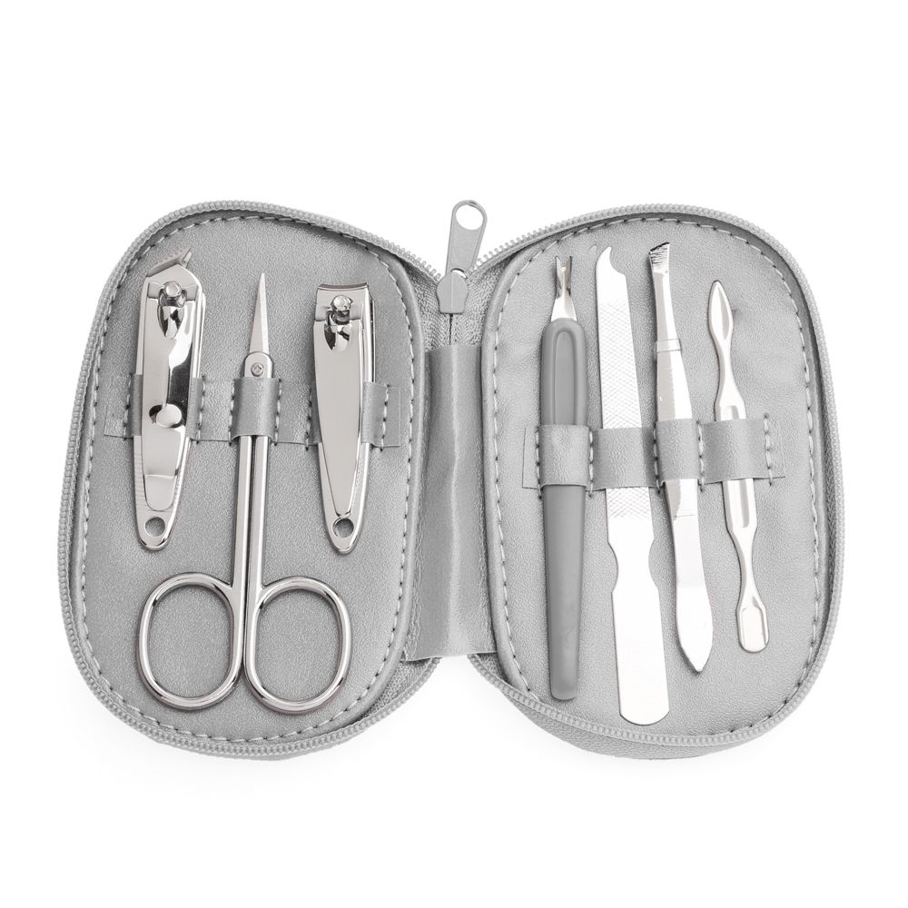 Descrição: Kit manicure 7 peças em estojo de couro sintético. Possui: cortador de cutícula, tesoura, cortador de unha, empurrador de cutícula, lixa, pinça e espátula.