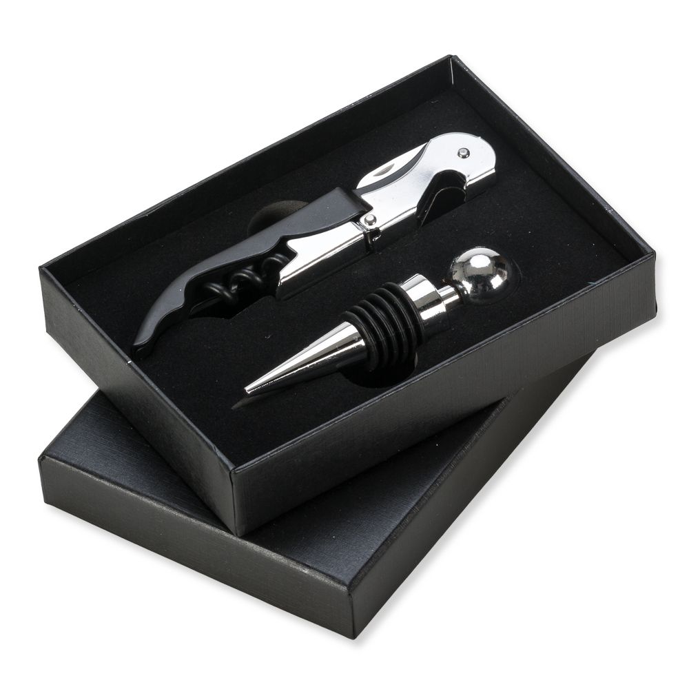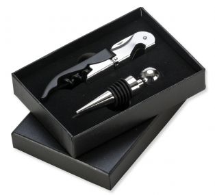 Kit vinho 3 peças em estojo de papelão. Estojo com "aba" frontal imãtizada para abrir/fechar, parte interna revestido com espuma e veludo. Possui: tampa de bico, tampa à vácuo e saca rolhas.