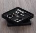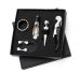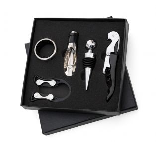 Kit Vinho 5 peças em caixa de papelão. compartimento interno revestido com espuma resistente. Possui Wine collar, saca rolhas,cortado de rolhas, abridor, bico condutor com tampa e tampa de bico. Caixa na cor preta.