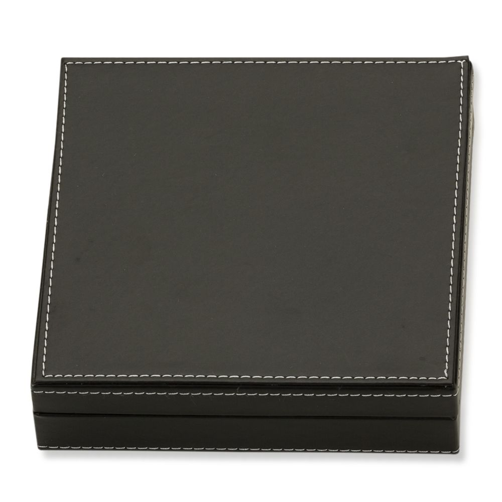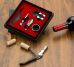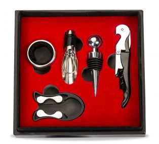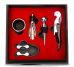 Kit vinho 5 peças em estojo de couro sintético com tampa, verso e parte interna revestida com veludo. Possui Wine collar, bico condutor com tampa, tampa de bico, saca rolhas e cortador de lacre.