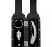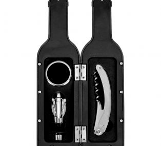 Kit vinho formato garrafa com 3 peças, material plástico resistente e revestido internamente com espuma. Possui wine collar, bico condutor com tampa e saca rolhas.