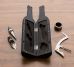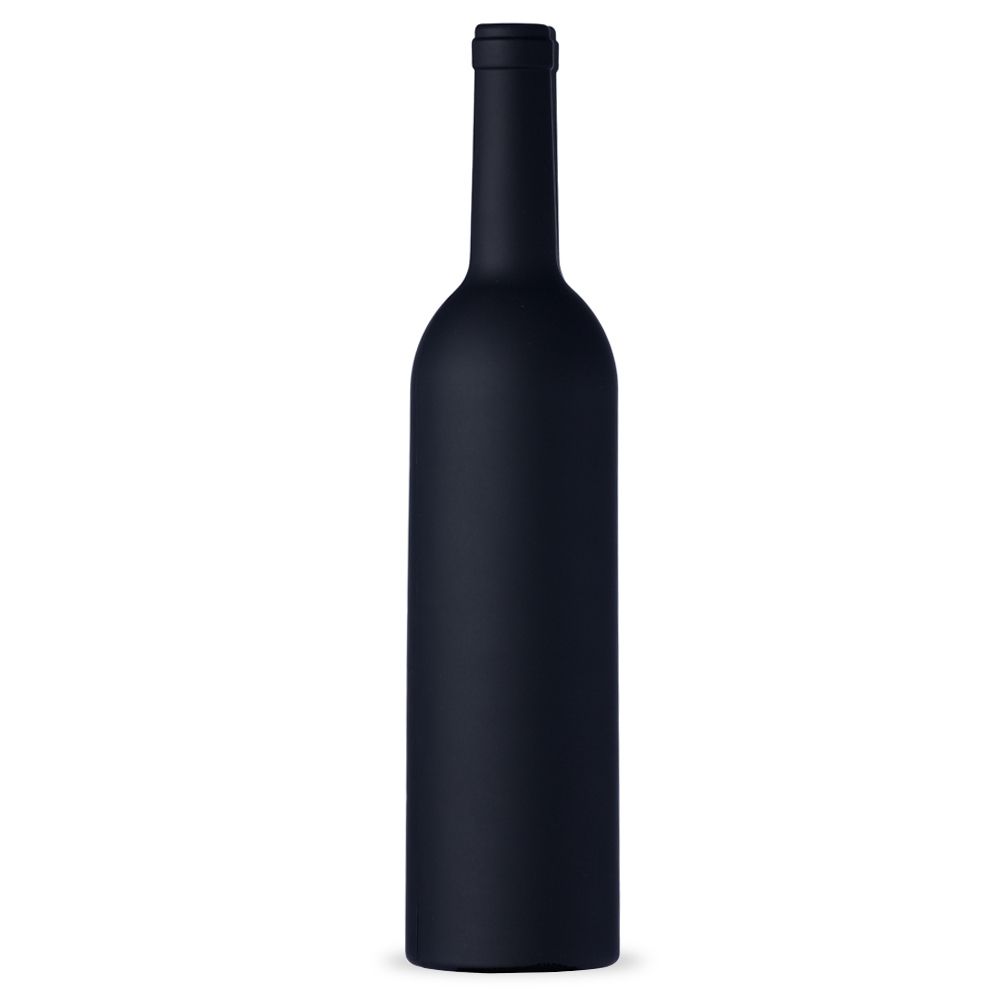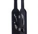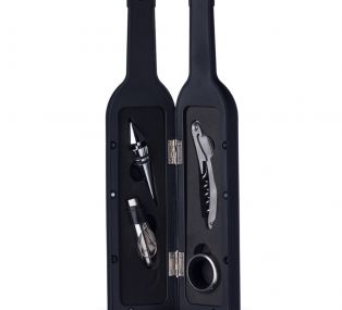 Kit vinho formato garrafa com 4 peças, material plástico fosco resistente revestido internamente com espuma. Possui tampa de bico, bico condutor com tampa, saca rolhas e wine collar. Fecha por um mecanismo de imã e encaixe.