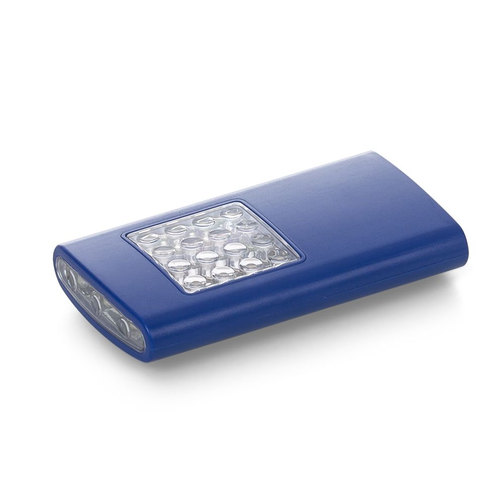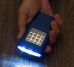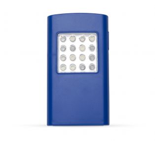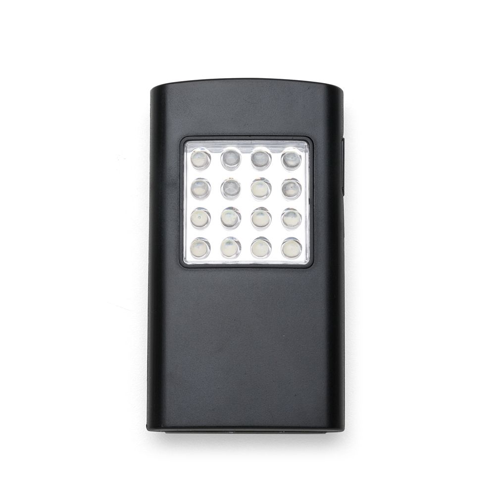 Descrição: Lanterna plástica de led com imã na parte traseira e suporte metal para gancho. Possui 3 leds na parte superior e 16 leds na parte frontal, ao apertar uma vez o botão na lateral acende o led frontal, apertando duas vezes acende o led superior e apertando pela terceira vez apaga-se o led. Necessário 3 pilhas AAA(não acompanha).